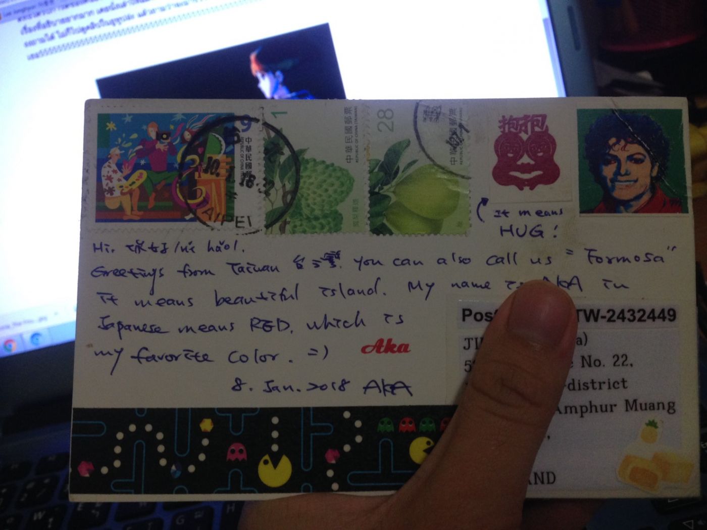 อันนี้เป็นโปสการ์ดที่เราได้มาฉบับแรกดีใจมาก sent 6/Jan/2018 received 4/Feb/2018 จากคุณ Akaka (Taiwan) เขียนมาน่ารักมากแถมยังติดสติ๊กเกอร์ไมเคิลมาให้ด้วย