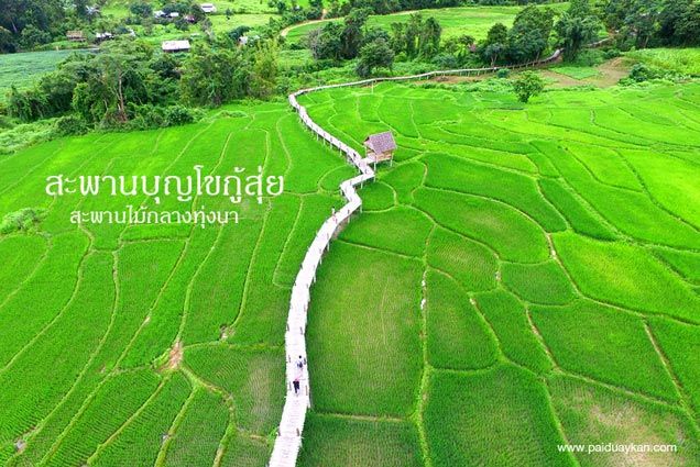 สะพานบุญโขกู้สุ่ย เป็นสะพานไม้ไผ่ที่ยาวถึง 815 เมตร ทอดผ่านทุ่งนาสีเขียวชอุ่ม เป็นสะพานที่ชาวบ้านสร้างถวายให้พระสงฆ์ใช้บิณฑบาตออกมาจากวัดป่าอีกฝั่งหนึ่ง โดยในเวลาประมาณ 7 โมงเช้า ชาวบ้านจะออกมาใส่บาตรกันบนสะพาน ซึ่งนักท่องเที่ยวก็สามารถร่วมใส่บาตรพร้อมชาวบ้านได้เลย