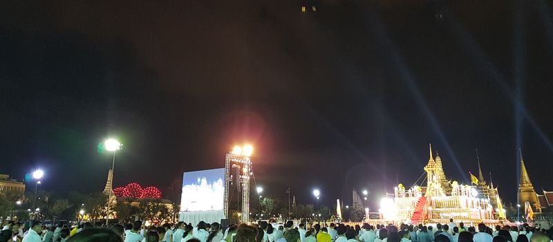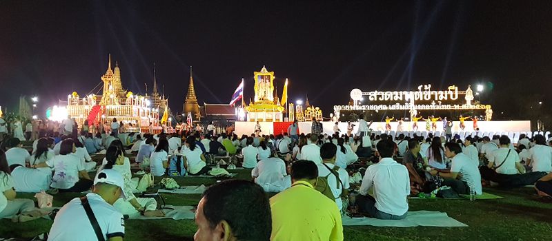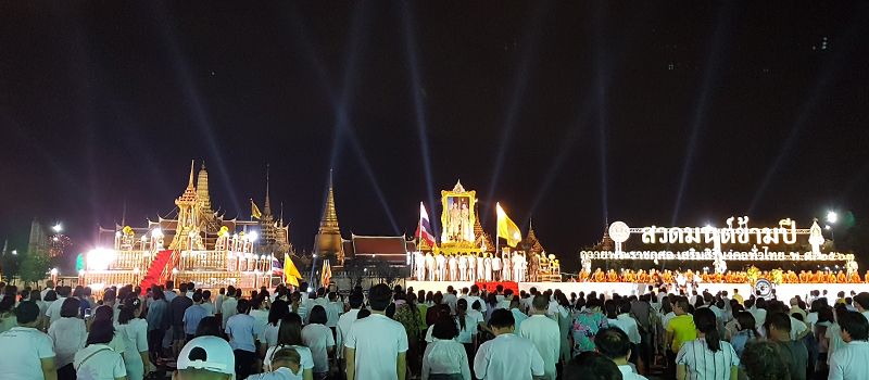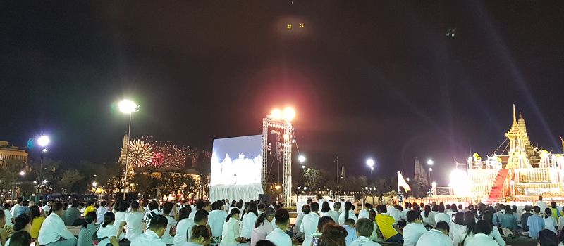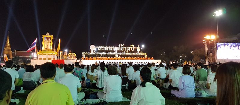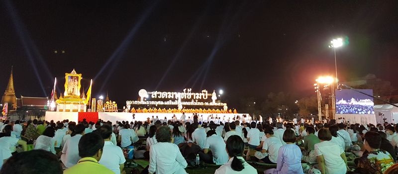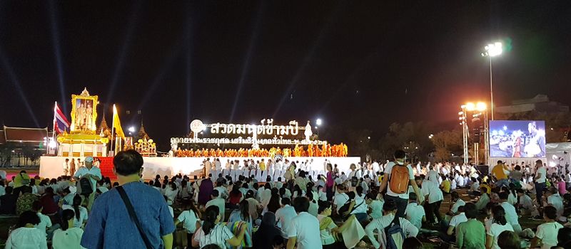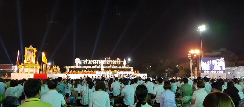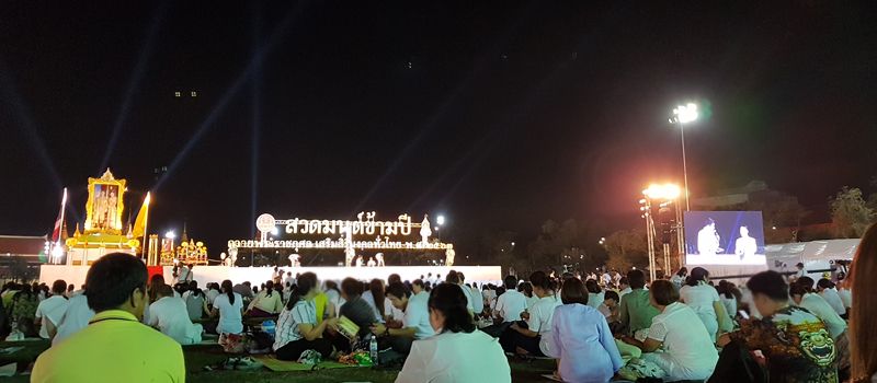 ตามกำหนดการก็จะเริ่มสวดมนต์ตอน 21.30 น. แต่พิธีกรก็แจ้งว่าประธานที่เป็นรัฐมนตรีกระทรวงวัฒนธรรมจะมาช้าเพราะไปทำบุญที่วัดโพธิ์มั้ง...ถ้าจำไม่ผิด...ส่วนประธานฝ่ายสงฆ์...ถ้าตามที่อ่านตามข้อมูลคือเจ้าคุณธงชัย....ตอนเกือบ 21.30 น. พระสงฆ์ก็ขึ้นมาบนเวที 68 รูปมั้ง...ตามพระชนมพรรษาในหลวง ร.10.....