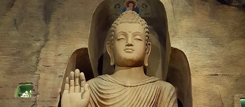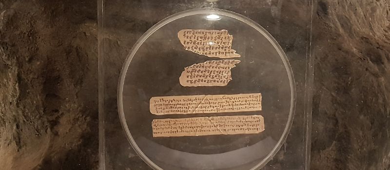 ตรงกำแพงข้างๆ องค์พระพุทธองค์ใหญ่ก็มีเหมือนสไลด์ฉายภาพพระที่มาบอกเล่าเรื่องราวการค้นพบคัมภีร์ทางพระพุทธศาสนาโบราณที่เขาว่าเก่าแก่ที่สุด