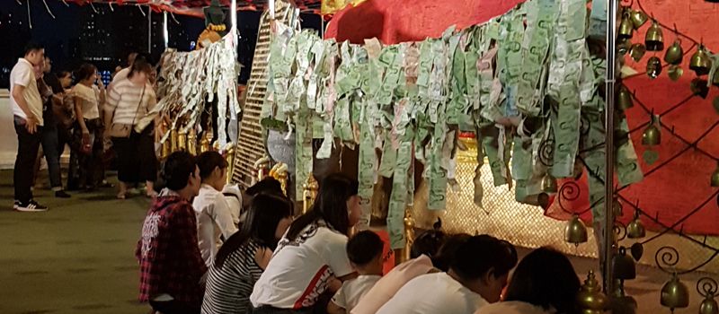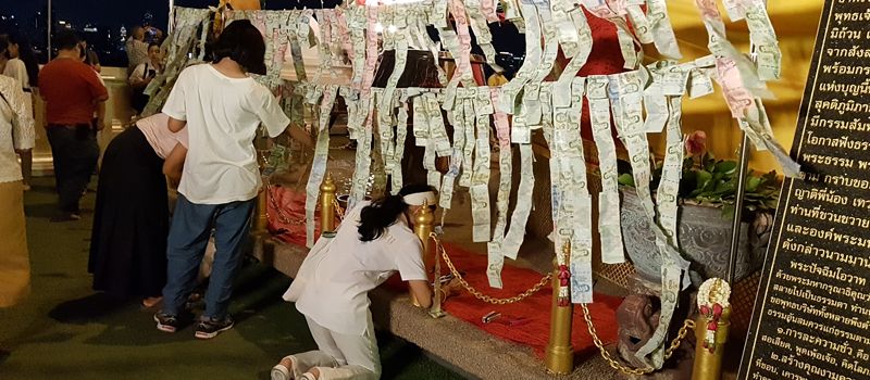 ขอบคุณหลวงพ่อมหาเศรษฐีนวโกฏิสำหรับคำทำนายก็เดินไปขึ้นองค์เจดีย์ภูเขาทองเพื่อขอพรและเขียนผ้าแดง