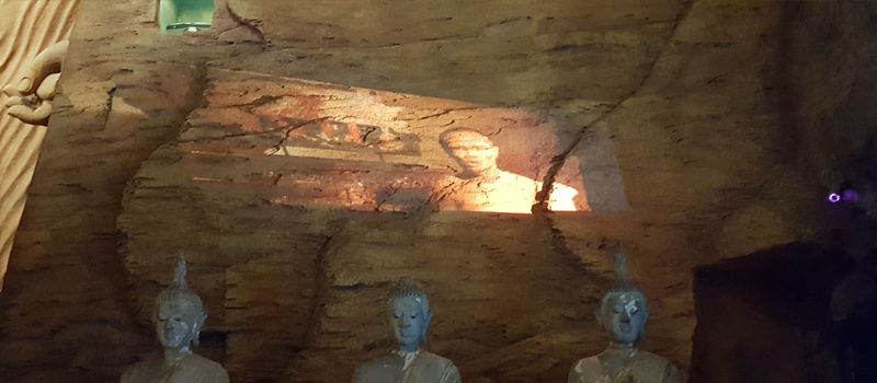 เดินลงมาชั้นล่าง...จะเดินไปหน้าวัดเพื่อออกไปด้านนอกก็เจอเหมือนห้องที่ทำเหมือนถ้ำมีพระพุทธรูปองค์ใหญ่และชิ้นส่วนคัมภีร์ทางพระพุทธศาสนาโบราณ