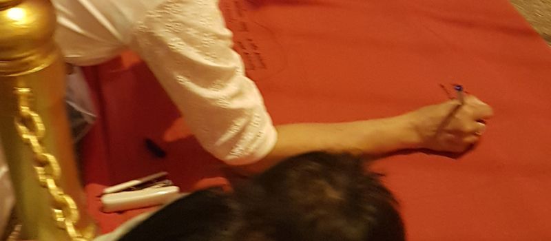 ไปหาที่เขียนทางฝั่งขวา...คือเต็มไปหมด...แต่ก็มีช่องว่างเล็กๆ ที่พอเขียนชื่อลงไปได้...ก็เขียนลงไปแบบตัวไม่ต้องใหญ่มากแล้วพอลุกขึ้นมา....มองไปทางฝั่งซ้าย...ก็เห็นคนมุงเยอะมากที่ก้มเขียนๆ กันอยู่...ก็สงสัยเพราะตอนที่ดูเมื่อกี้..มันเหมือนไม่มีที่ว่างบนผ้าแดงให้เขียน...แต่นี่...คนมุงเยอะมาก...แล้วเรียงแถวกันไป...เลยลองเดินไปดูๆ...ก็เลยรู้ว่าเจ้าหน้าที่เอาผ้าแดงผืนใหม่มาให้เขียน