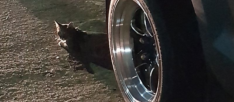 เดินกลับบ้านก็จะถึงบ้านแล้วก็เจอแมวอยู่ตรงล้อรถ...เอามือวางเหนือหัวแบบไกลๆ...สูงๆ...หมุนๆ...มันก็หันตามมือที่เลื่อนไป...ก็เลยถ่ายภาพไว้
