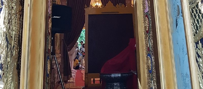เดินออกจากรอบเจดีย์..ก็วนไปด้านที่เห็นว่ามีโบสถ์อยู่...ก็มีพระประธานเล็กๆ อยู่ในสุด..มีคนไหว้...มีคนมุงด้านหน้าโบสถ์ก็หลายคน...มี 2 คนด้านหน้าเหมือนจะเข้าไปแต่ออกมาแบบคนเยอะ...เราเลยเดินเข้าไปแทน...ก็พอมีที่นั่งได้แถวๆ ประตู..ก็เลยลงไปนั่งไหว้พระขอพร...ก็มีพระรูปหนึ่งยืนพูดๆ ด้านหน้า มีที่กั้น....ก็อาจใกล้เวลาทำวัตรเย็นก็ได้