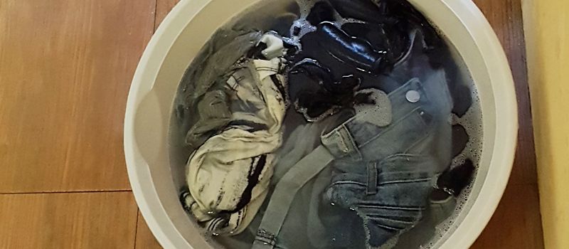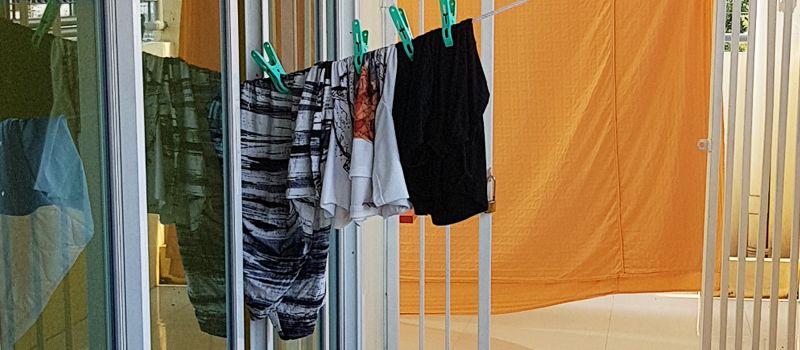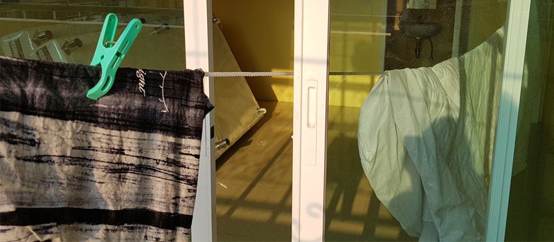 ซักผ้าปกติมี 2 กะละมังอาจจะดีกว่า แบบเปลี่ยนน้ำแช่น้ำ บีบผ้าจากกะละมังนี้ไปไว้อีกกะละมัง แต่นี่คือต้องวางผ้าบนพื้น แต่ก็พื้นห้องน้ำที่เราเพิ่งอาบน้ำแหละ ก็ดีกว่าไม่มีกะละมังซักผ้าเลย...ซักแล้วก็แบกกะละมังใบน้อยขึ้นไปชั้น 6 ระหว่างทางก็น่ากลัวนึกถึงเรื่องผีที่ป้า ป. เล่าที่เขาอยู่ชั้น 4 และ 5 และวันนี้ป้าแกไม่ขึ้นมาเปิดห้องรับแดด ก็เลยมืด..แบกไปถึงชั้น 6 ได้ก็โอเคแต่กลัวตอนลงอีก...ขึ้นไปก็เก็บห้องหมดแล้ว เตียงโดนยกขึ้นหมด..ก็เดินไปตากๆ...ก่อนขึ้นมา ป้า ป. ออกจากห้องพอดี ก็บอกเอาไม้หนีบหนีบด้วย เราก็โอเค แต่พอมาหนีบจริง หนีบไม่อยู่เพราะสายเชือกที่เอียง ที่ไม่เอียงคือตากผ้าปูที่นอนอยู่ ที่ไม่พอ ตากได้แค่กางเกง 2 ตัว ส่วนเสื้อ 3 ตัวออกมาราวด้านนอก