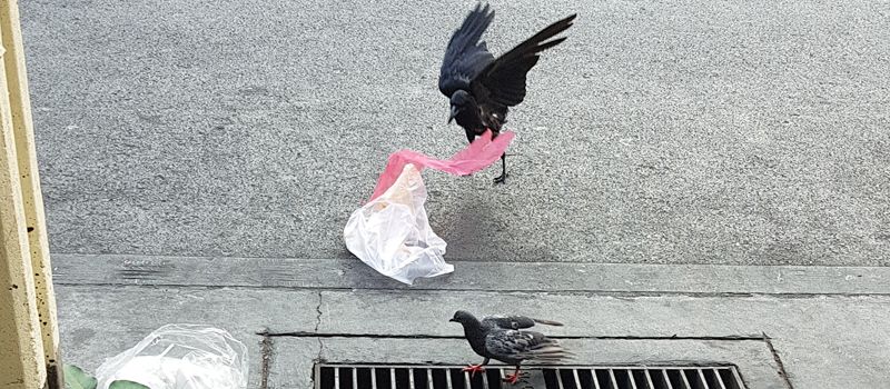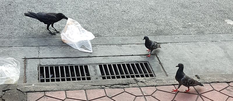 ออกไปตอน 17.35 น. ใส่หน้ากากอนามัยเรียบร้อย ก็ไม่แน่ใจมีคนมาออกกำลังกายมั้ย แต่เดินๆ ออกไปดูก่อน...ระหว่างทางก็เจออีกากำลังแย่งถุงพลาสติกอยู่ น่าสนใจดี