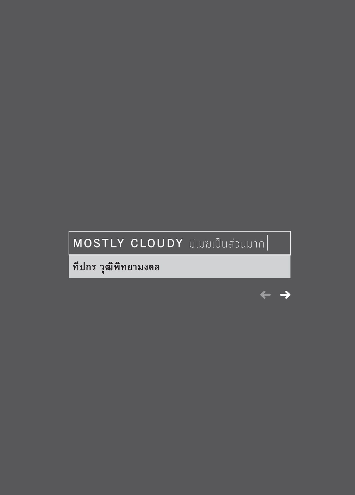 เจเนอเรชั่นของผมจะเรียกเงาทะมึนบนฟ้าว่า ‘ID4’ เจเนอเรชั่นก่อนหน้าผม คุ้นๆ ว่าเคยได้ยินคนเรียกกันว่า ‘บรรยากาศมาคุ’ เจเนอเรชั่นนี้จะเรียกมันว่าอะไรก็ไม่รู้ แต่หนังสือ MOSTLY CLOUDY มีเมฆเป็นส่วนมาก เป็นจุดเริ่มต้น
