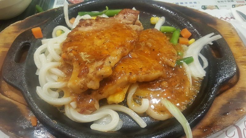 ไม่นานนักสเต็กหมูสองชิ้นก็มาเสิร์ฟพร้อมกับเส้นอุด้งผัดในจานกะทะเหล็ก หัวหน้าทัวร์มีน้ำจิ้มแจ่วมาให้พวกเราด้วย น้ำจิ้มแจ่วช่วยให้โลมากินสเต็กหมูจานนี้ได้เอร็ดอร่อยขึ้น กินกับผักสลัดก็โอนะ