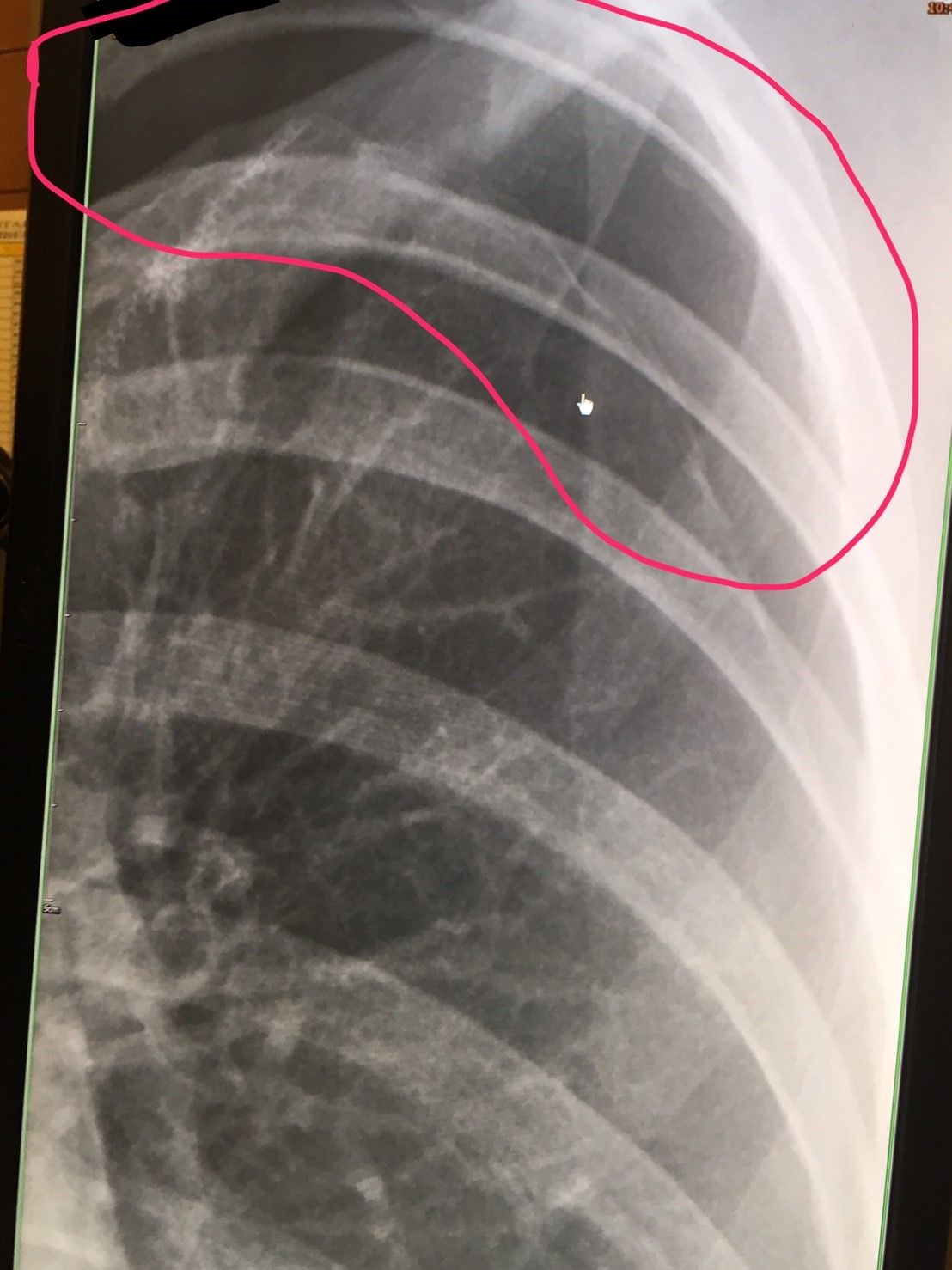 เราโดนส่งไปห้องฉุกเฉินของโรงพยาบาล ให้ออกซิเจนและรีบพาไป X-ray โชคดีหน่อยที่เรารู้มาก่อนว่าอาการนี้อาจจะเป็นปอดรั่วเลยรีบบอกหมอ พอดูผลตรวจก็เห็นเลยว่าปอดข้างซ้ายเล็กกว่าข้างขวาและน่าจะกำลังแฟบลงเรื่อยๆ