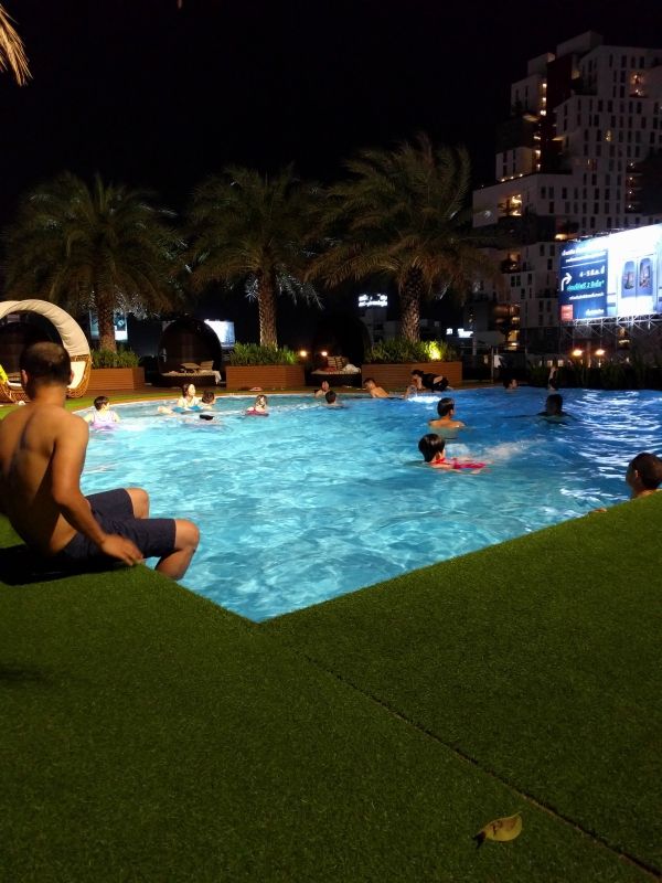 พอมาถึงชั้นฟิตเนส ออกมาก็เจอคนไทยเล่นฟิตเนสกันสบายๆ เหมือนที่เราเห็นประจำ แต่มันมีมากกว่านั้น... คือพวกพี่จีนแม่งลงลิฟต์อีกตัวใส่ชุดว่ายน้ำกันหมดเดินออกมาจะไปสระ ตอนนั้นคิดแล้วว่าแม่งต้องมีอะไรแน่ๆ พอเขียนลงเวลาเข้าเสร็จ เดินไปสระ สิ่งที่เจอทำให้หมดแรงจะว่ายน้ำเลย