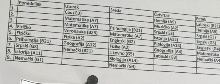 Fizičko=Gym class, Psihologija=Psychology, Srpski=Serbian language (เรียนเกี่ยวกับการเขียน/อ่านเรียงความ), Istorija=History,Nemački=German, Čos=Homeroom, Matematika=Maths, Veronauka=ศาสนา, Fizika=Physics, Geografija=Geography, Engleski=English, Likovno=Arts, Biologija=Biology, Hemija=Chemistry, Muzičko=Musics, Latinski=Latin