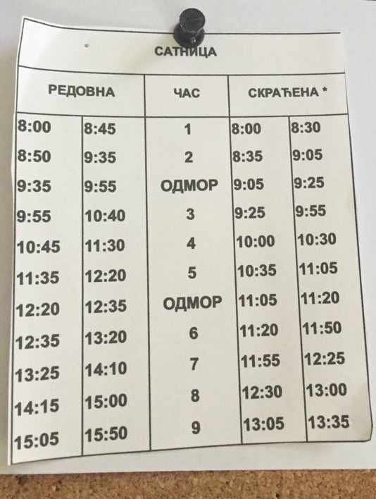 วันนี้เราจะมาพูดถึงเรื่องโรงเรียนกัน โรงเรียนที่นี่แบ่งเป็นสอบแบบใหญ่ๆคือ Gymnazija (โรงเรียนมัธยมธรรมดา) กับ โรงเรียนเฉพาะทาง (Medical,Cooking,Law,Arts,Language,Mechanics etc.) โรงเรียนที่เราเรียนคือแบบ Gymnazija เรียนเหมือนวิทย์ปนศิลป์อะ คือมีฟิสิกส์ เคมี ชีวะ แต่ก็ต้องเลือกเรียนภาษาที่3ด้วย ก็มีฝรั่งเศส,เยอรมัน,รัสเซีย แต่ห้องนี่เรียนเยอรมันก็เลยต้องเรียนเยอรมันไปด้วย คิดดูนะ เรียนเยอรมันเป็นภาษาเซิร์บอะ 555555 วิชาที่ไม่เหมือนที่ไทยก็จะมีปรัชญากับภาษาละติน โรงเรียนที่นี่จะไม่มีกินข้าวเที่ยงนะ อธิบายกันก่อนว่า มื้ออาหารที่สำคัญที่สุดของที่นี่คือมื้อกลางวัน พอเลิกเรียนประมาณบ่าย2 ก็กลับไปกินข้าวบ้าน ส่วนมื้อเย็นคนที่นี่จะกินดึกประมาณ3-4ทุ่ม ใครจะกินไม่กินก็แล้วแต่ ระบบที่นี่คือเป็นแบบเดินเรียน แต่จะมีคาบนึงจะเป็นคาบคุยกับครูประจำชั้น (čos) ครูประจำชั้นเรียกว่า Razredna ครูของนี่สอนอังกฤษรู้สึกโชคดี 5555 ปกติโรงเรียนที่นี่จะมี2กะ คือกะเช้า กับ กะบ่าย กะเช้าก็ปกติไปโรงเรียน8โมงเลิกบ่าย2 แต่กะบ่ายคือไปโรงเรียนประมาณบ่ายโมงเลิกหนึ่งทุ่ม แต่โรงเรียนนี่เป็นโรงเรียนเดียวในเมืองที่มีแค่กะเช้ากะเดียว นี่คิดว่าดีนะ กะบ่ายมันดูแบบเหนื่อยอะ เพื่อนนี่ก็บ่นกันว่าไม่ชอบกะบ่ายกะเช้าดีกว่า วัยรุ่นที่นี่คือขี้อาย แบบไม่กล้าพูดภาษาอังกฤษ แต่พอพวกมันเมาเท่านั้นแหละ คุยภาษาอังกฤษเป็นน้ำไหลไฟดับเลย