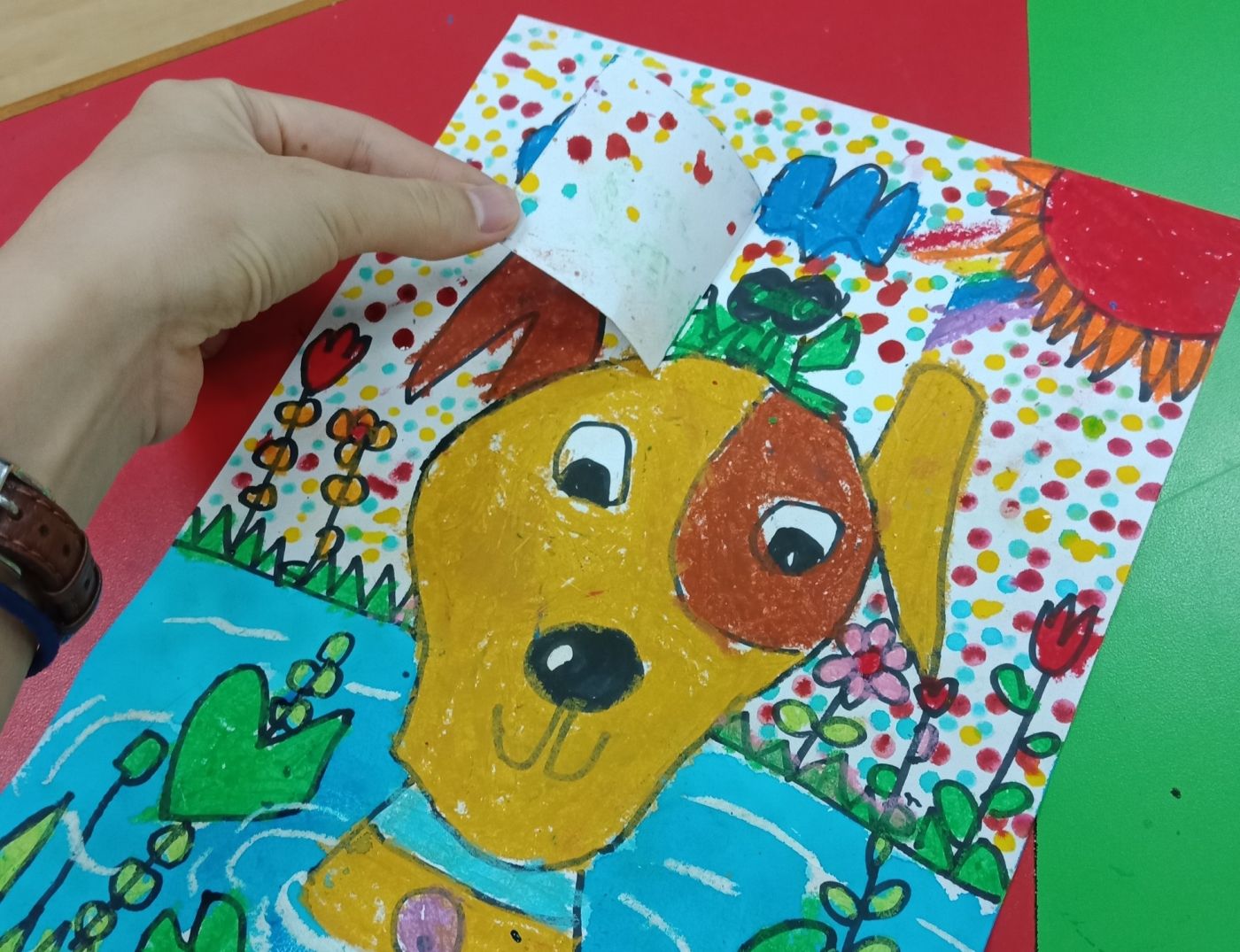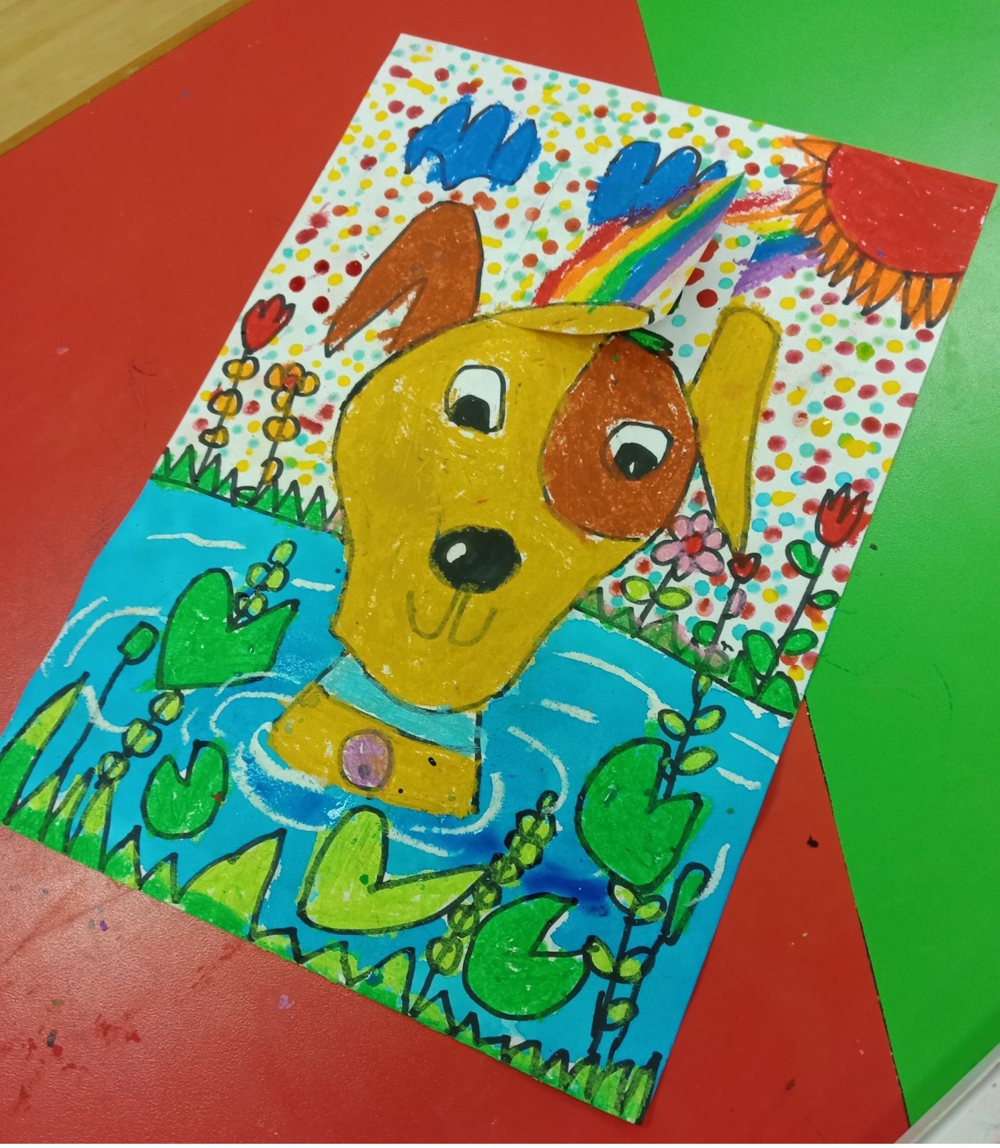 คาบต่อมาพี่ปุ๋ยก็สอนวาดสุนัข งานนี้ค่อนข้างซับซ้อน ใช้ทั้งสีชอล์กทั้งสีน้ำ แลเวก็วาดสัตว์บนหัวสุนัขที่ซ่อนไว้หลังกระดาษอีกด้วย น้องที่เราคุมค่อนข้างช้า ระบายสีไม่เก่งเท่าไหร่ น้องบางคนจับดินสอไม่ถูกวิธีด้วย แล้วก็ระบายสีไปหลายทิศทางมาก ก็ต้องค่อย ๆ เปลี่ยนวิธีจับสีของน้อง แล้วก็คอยย้ำให้น้องระบายสีไปทางเดียวกัน ระบายสีเข้ม ๆ น้องแต่ละคนความคิดสร้างสรรค์มากเลยระบายสีสุนัขไม่เหมือนกันเลยซักตัว มีทั้งสีชมพู สีฟ้า สีน้ำเงิน หลังจากระบายสีชอล็กเสร็จก็ระบายสีน้ำต่อ เด็กหลาย ๆ คนชอบระบายสีน้ำเหมือนกับระบายสีไม้ คือถูไปถูมา กระดาษเลยเริ่มเปื่อย เราก็ต้องจับมือน้องให้น้องค่อย ๆ ปาดสีไปทางเดียว นี่คืองานของน้องคนนึงที่เราดูแล น้องระบายสีเข้ม ไม่ค่อยออกนอกเส้นเลย