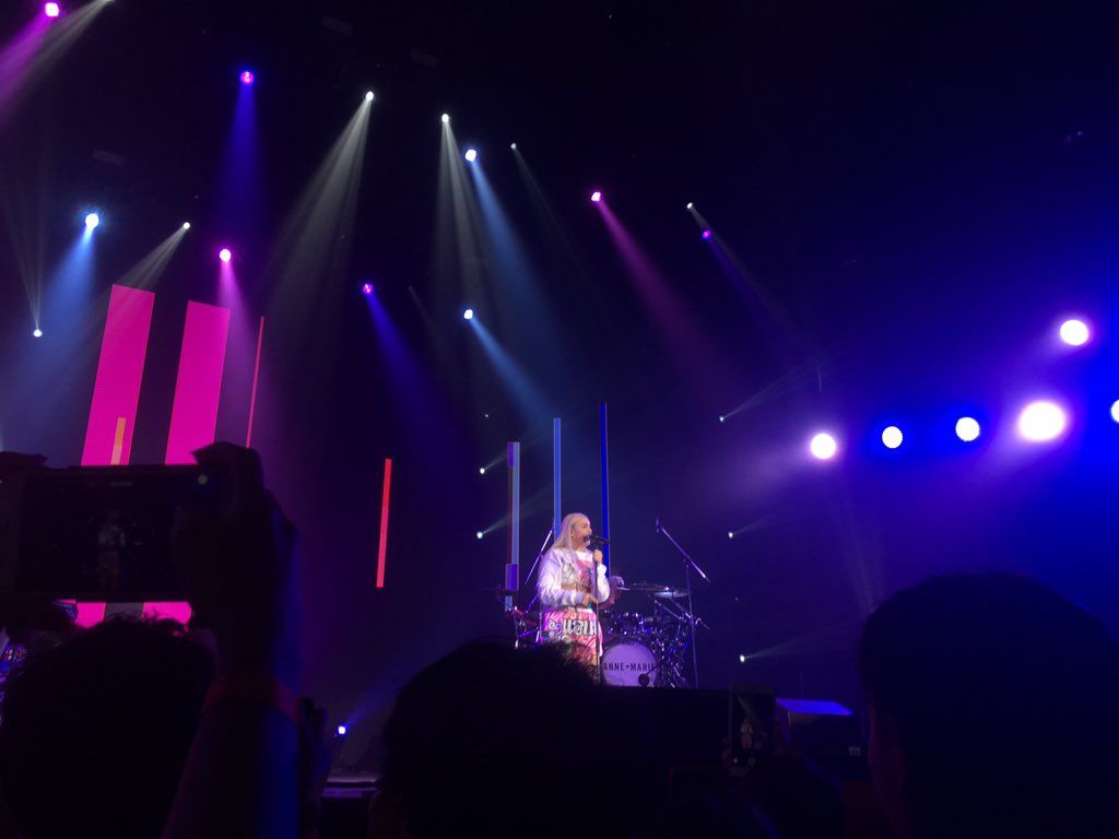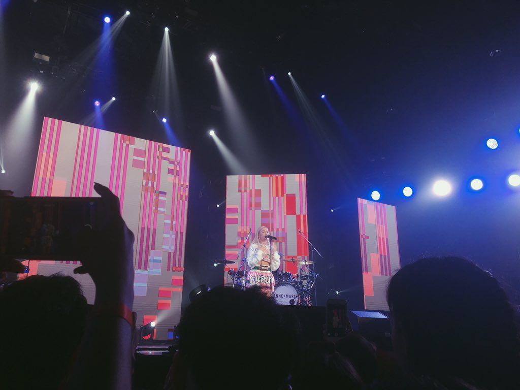 ต่อมาคนที่ 4 ค่ะ Anne Marie คนนี้ผิดคาดมาก เราทำการบ้านฟังเพลงเขาไปนิดหน่อย ไม่ถูกจริตนัก แต่พอแบบไลฟ์โอเคมากๆเลยค่ะ นางใส่กางเกงมวยมา ปักอักษรว่า แอนน์ โทนชมพูขาว ผมบลอนด์น่ารักมาก แงงง ชั้นทาสสาวผมบลอนด์ค่ะ ยิ้มน่ารักมาก มากับวงค่ะ มีกลองแล้วก็มีคีย์บอร์ด ส่วนเขาร้องนำ เขาเอนจอย มากค่ะที่ทุกคนร้องเพลงเขาได้
