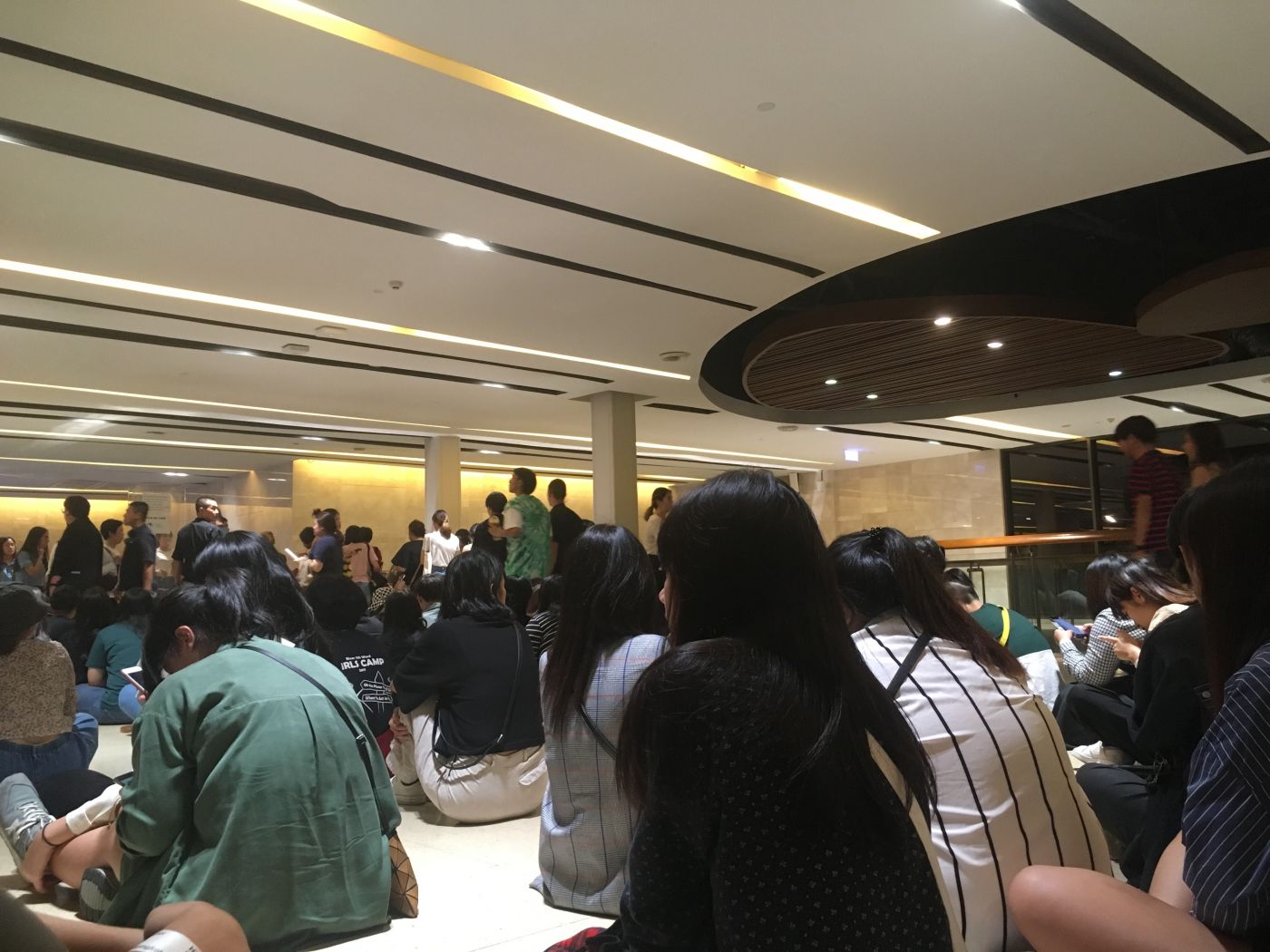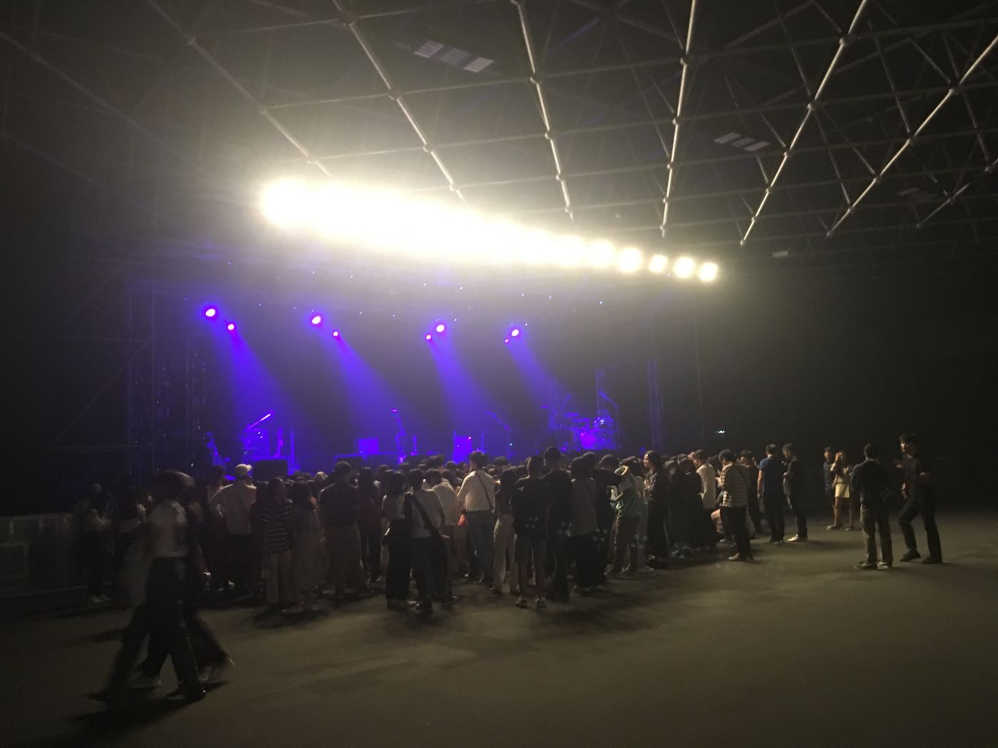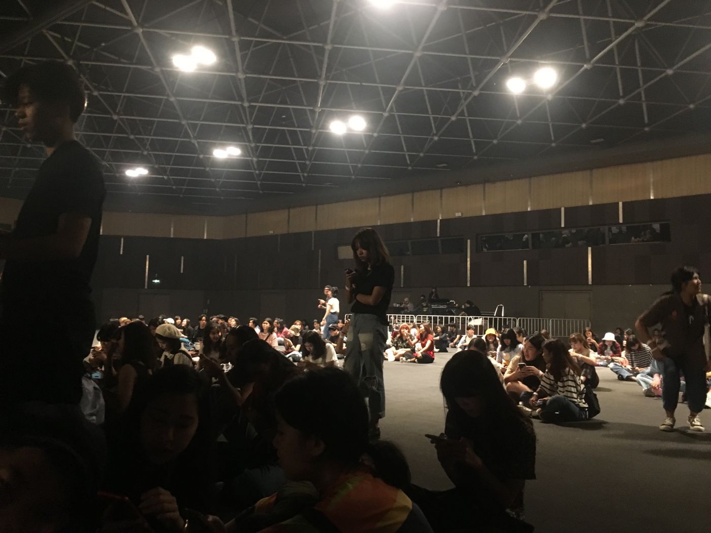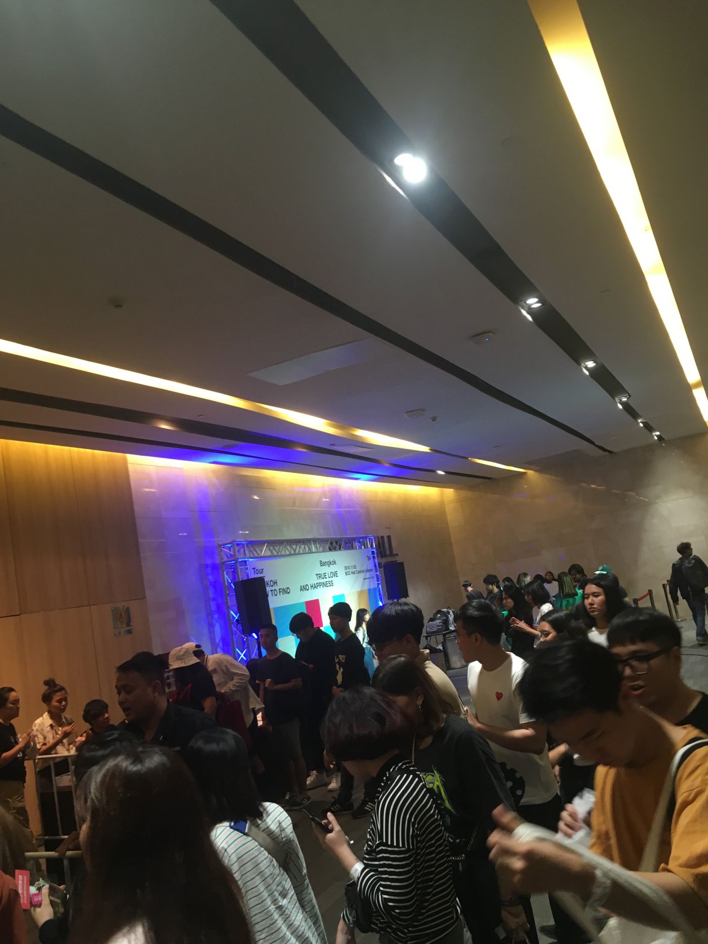 เหมือนรั้วตรงนี้คือราคาแปดร้อยบาท เส้า แต่เอาจริงๆคนในงานก็ดูไม่ได้ซีเรียสกับความเป็นฟรอนท์โรวอะไร โซน B ก็มีคนไปจับจองพื้นที่ด้านหลังกันเยอะเลย แต่ฮอลล์กว้างมาก เหมาะแก่การเตะฟุตบอล กินมะม่วงน้ำปลาหวานและเล่นไพ่อูโน่กับคนข้างๆมาก หรือจะตีลังกาเล่น นอนรอก็ย่อมได้ค่ะ