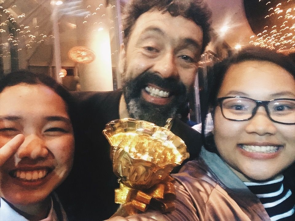 ค่ะ แล้วเราก็ไปขอลุงใจดีคนนั้นด้วย เซลฟี่เลยจ้า แกก็เอาถ้วยรางวัลไปถือ55555555