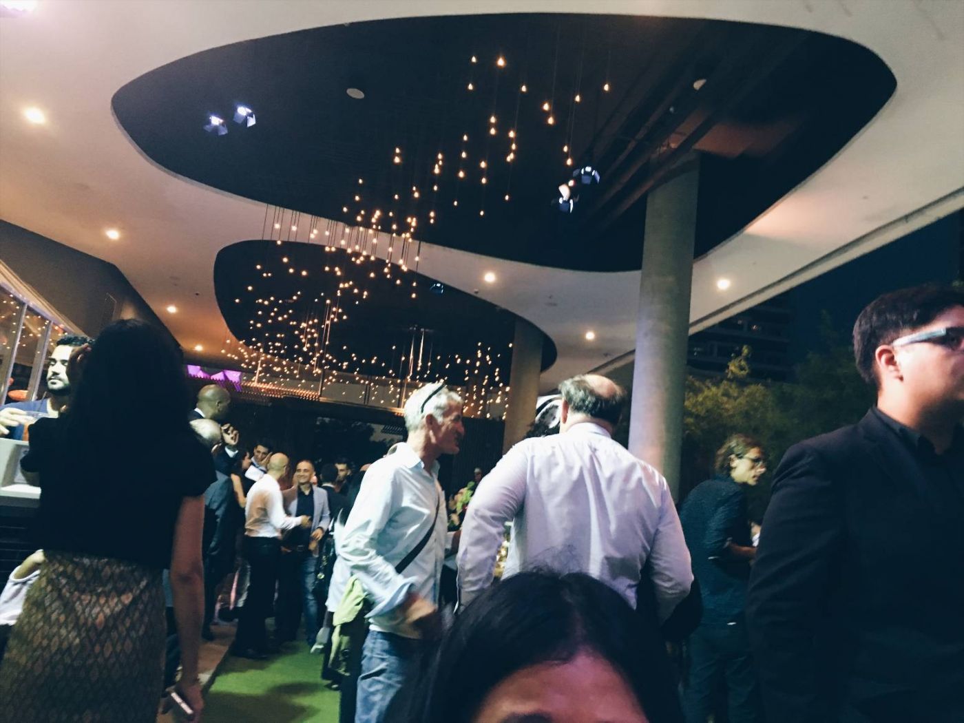 มีดนตรีแจ๊ซให้ฟัง เราชอบนักร้องมาก น่ารักและสวย ร้องเพลงเพราะอีก มีเก้าอี้นิดเดียวแต่แขกล้นงานเลยค่ะ แต่ก็ดูทุกคนไม่ได้เดือดร้อนอะไร เขาก็ยืนคุยธุรกิจกัน ได้ยินหลายภาษามาก อังกฤษ ไทย อิตาเลียน มีเครื่องดื่มด้วย ถ้าผู้ใหญ่ก็คงรู้สึกว่ามันไม่แย่ แต่เราผู้กินได้แค่วิญญาณน้ำแอปเปิ้ล ก็ไม่ได้รู้สึกดีเท่าไหร่ แล้วก็มีของว่าง สไตล์ค็อกเทลปาร์ตี้แหละค่ะ แต่ด้วยความคนเยอะ เราไม่สามารถเอาสังขารอันอ้วนตันของเราไปหยิบยื่นอาหารได้ เลยไปนั่งรอที่เก้าอี้
