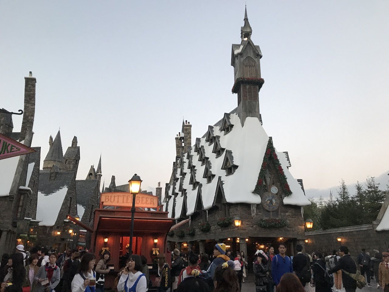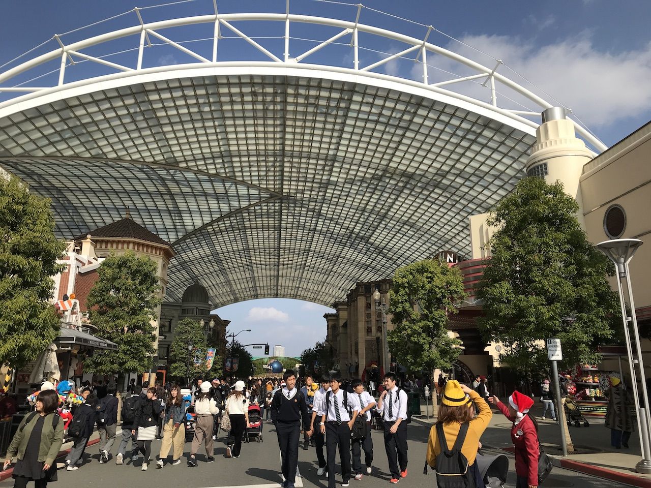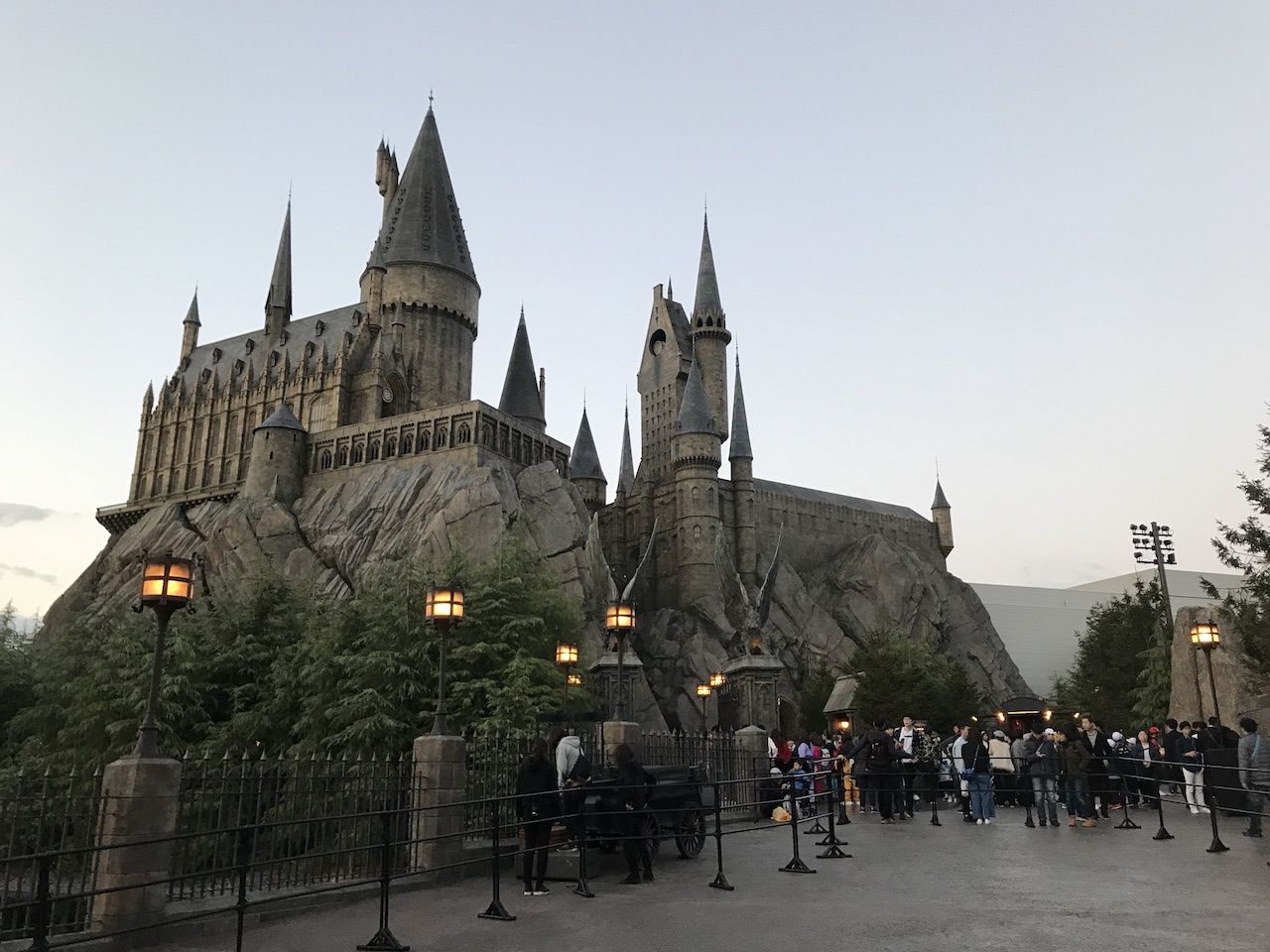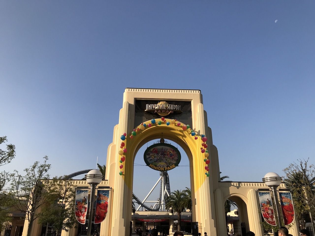 พวกเรามาถึง USJ กันตั้งแต่เช้าตรู่ สังเกตที่ด้านขวาของภาพยังมีดวงจันทร์ปรากฎอยู่บนฟากฟ้าอยู่เลย ถือคติที่ว่านกที่ตื่นเช้าจะได้กินหนอนตัวอ้วนกลมฉันใด คนที่ตื่นเช้าก่อนชาวบ้านชาวช่องเขาก็จะได้เข้าพาร์คก่อนฉันนั้น