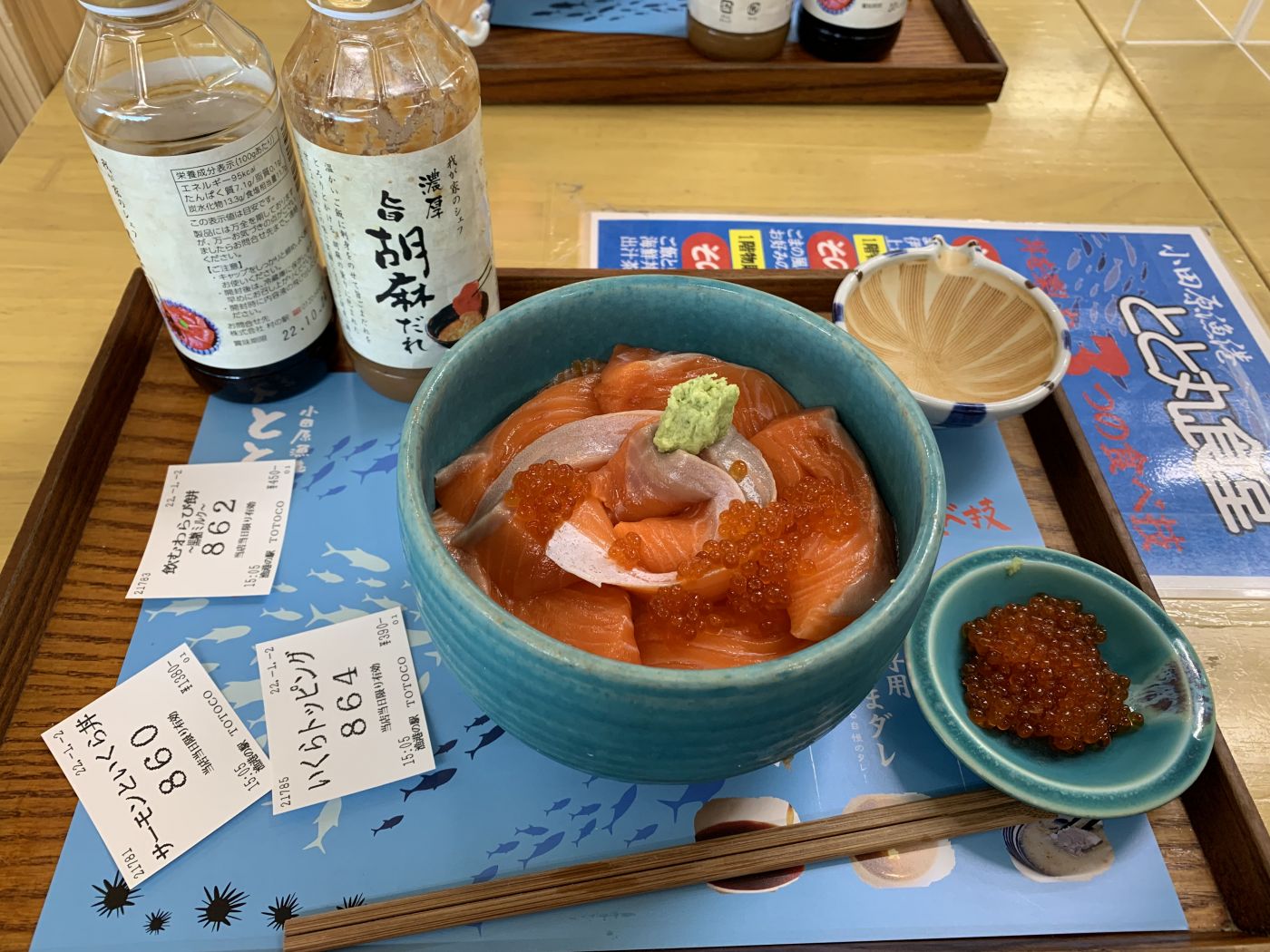 เมนูต่อไป! อาจจะเป็นเมนูธรรมดา ที่ทุกคนก็กินกันบ่อย นั่นคือข้าวหน้าแซลมอนดิบ คือที่เราไปกินมาเนี่ย มันก็ไม่ได้แปลกแตกต่างจากที่อื่นอะไรแบบนั้น แต่ว่าร้านติดทะเล ก็ต้องขึ้นชื่อเรื่องความสด คือแบบสดจนเหมือนไปว่ายอยู่ในทะเลเลยอะค่ะ ปลาชั้นหนา ใหญ่ ให้เยอะ และที่สำคัญ ถูกมาก 1380 เยนเท่านั้น! มากกว่านี้ ไม่ขาย!!!!