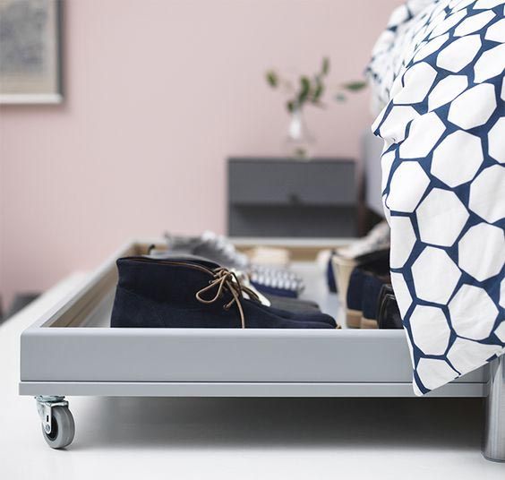 ลิ้นชักเก็บรองเท้าแบบสไลด์ - หลายคนต้องไม่เชื่อแน่ ๆ ว่าตัวลิ้นชักสีขาวนี้ ทำมาจากประตูตู้ใส่เครื่องครัวที่สามารถหาซื้อได้จาก IKEA เพียงแค่เพิ่มล้อเข้าไปทั้ง 4 มุม ประตูตู้ใส่เครื่องครัวก็จะแปลงร่างเป็นลิ้นชักเก็บรองเท้า ที่สามารถเลื่อนหยิบรองเท้าคู่โปรดมาใส่ได้อย่างง่าย ๆ
