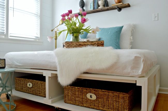 วางลิ้นชักเก็บของไว้บนฐานเตียง - ทริคที่จะทำให้ลิ้นชักเก็บของดูดีมีสไตล์และเข้ากันกับเตียง คือ การเลือกใช้โทนสี หากเตียงของเราเป็นโทนสีพื้นง่ายๆ ก็สามารถเข้ากันได้ดีกับสิ่งของที่จับมาวาง อาจเลือกใช้ตะกร้าสานสไตล์ rustic ที่นอกจากจะเพิ่มความเก๋แล้วยังให้ความรู้สึกอบอุ่นทุกครั้งที่มองอีกด้วย