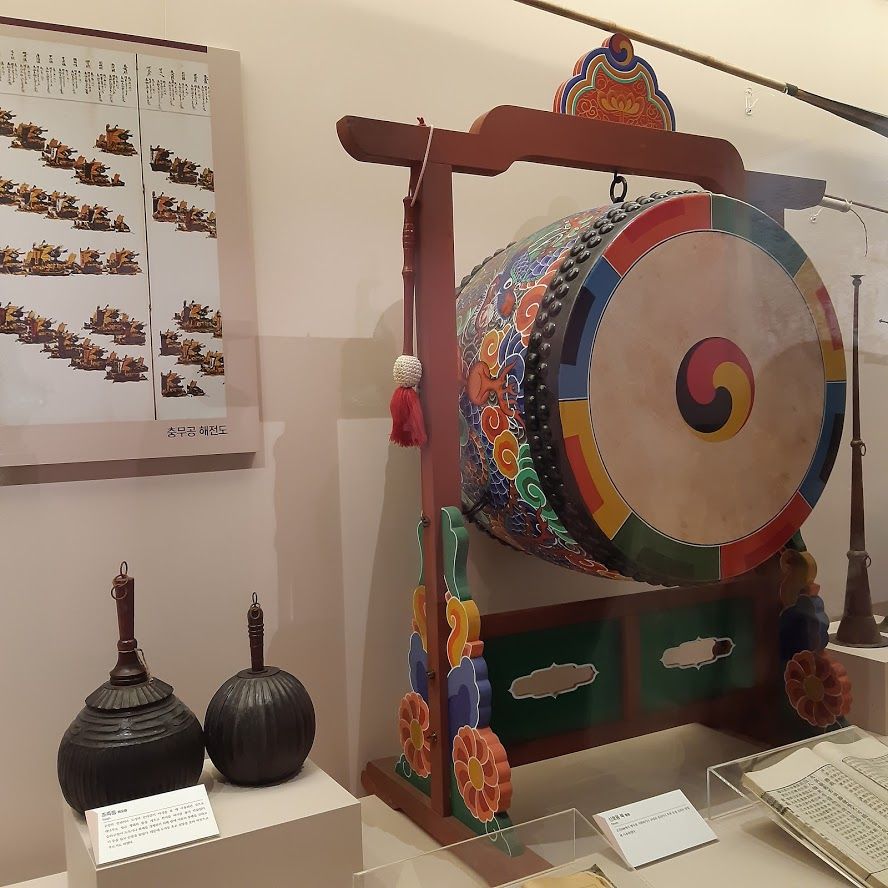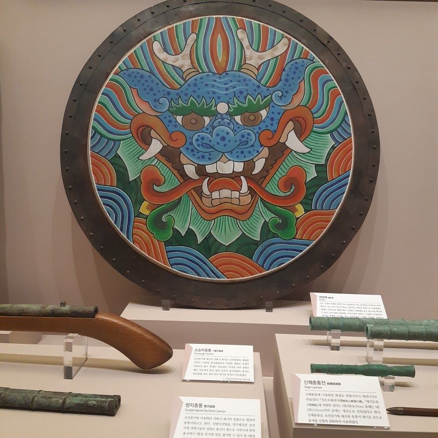 ติดใจโล่และกลองสองชิ้นนี้เป็นพิเศษ เพราะสองสามวันต่อมาได้เห็นของที่หน้าตาคล้าย ๆ กันที่การจำลองผลัดเวรยามที่พระราชวังเคียงบก อาจไม่เหมือนกันสักทีเดียว แต่ก็คล้าย ๆ กันแหละ ทำให้สีอันเยอะ ๆ สีจัด ๆ imprint ในสมองฉันว่า ลักษณะแบบนี้ เกี่ยวกับโชซ็อนแน่ ๆ (ฉันอาจเข้าใจผิดก็ได้)