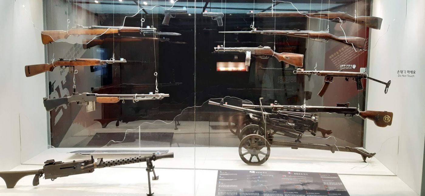 ขอยกให้ตู้จัดแสดงนี้เป็นที่สุดของการเยี่ยมชมอนุสรณ์สงครามเกาหลี ตู้จัดแสดงอาวุธ โดยทางขวาเป็นปืนของเกาหลีเหนือ ซ้ายเป็นของเกาหลีใต้ หันหน้าเข้าหากัน ที่น่าสนใจคือปืนของฝั่งเกาหลีเหนือจะเยอะกว่าทางซ้าย ไม่ใช่แค่ตู้นี้ ป้ายนิทรรศการก็พยายาม