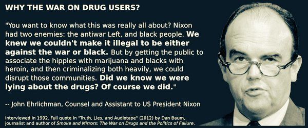 นอกจากนี้ John Ehrlichman ที่ปรึกษาของปธณฯ Nixon ยังออกมายอมรับด้วยตัวเองว่า นโยบาย War on Drugs นั้นมุ่งเป้าหมายไปที่คนแอฟริกันอเมริกันและฮิปปี้รักสันติ โดยเขากล่าวว่า “คุณอยากรู้จริงๆเหรอว่า[นโยบาย War on Drugs]นี่มันเกี่ยวกับอะไร? Nixonน่ะ มีศัตรูอยู่สองพวก คือ พวกซ้ายรักสันติและคนดำ เรารู้ว่าเราไม่สามารถทำให้การเป็นพวกต่อต้านสงครามกับคนดำเป็นเรื่องผิดกฎหมาย แต่การที่เราทำให้ฝูงชนไปยุ่งเกี่ยวกับกัญชาของพวกฮิปปี้กับเฮโรอีนของคนดำแล้วฟาดพวกเขาหนักๆด้วยกฎหมาย เราจะสามารถทำลายชุมชนของพวกเข้าได้ เรารู้ไหมน่ะเหรอว่าเราโกหกเกี่ยวกับเรื่องยา? แหงอยู่แล้ว”