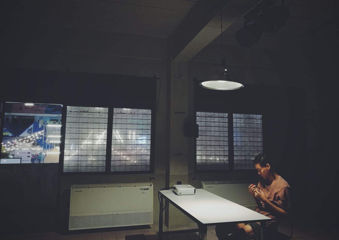 เราได้ดูการแสดงของพิชในระยะใกล้ชิด ฉากมีเพียงโต๊ะ โปรเจคเตอร์ โคมไฟคล้ายในห้องสอบสวนและเก้าอี้สองตัว