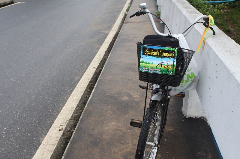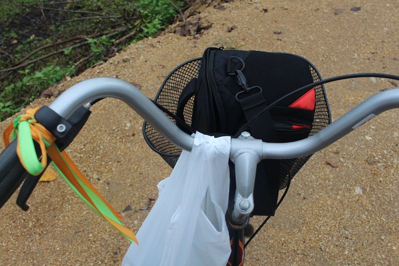 ทรัพย์สมบัติบนจักรยานก็ประมาณนี้ กระเป๋ากล้อง ที่ข้างในมีเพาเวอร์แบงค์, สายชาร์จกล้องและมือถือ, กระเป๋าตัง, หูฟัง ส่วนในถุงพลาสติกนั้นมีน้ำเปล่า 1 ขวดกับร่ม #เที่ยวคนเดียวต้องเตรียมพร้อมตลอดเว