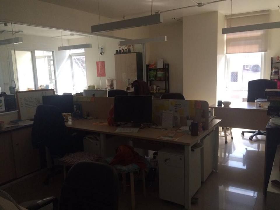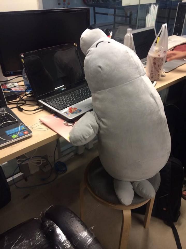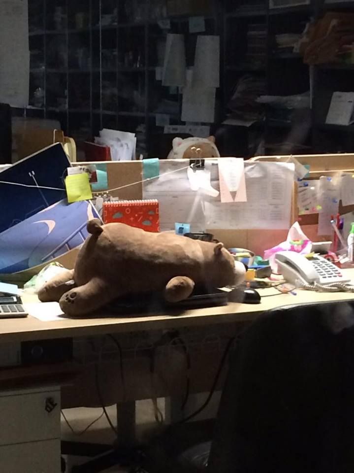 ด้วยความที่พื้นที่ห้องออฟฟิศไม่สัมพันธ์กับจำนวนคน ที่เดี๋ยวมีคนนั้นคนนี้แวะเวียนมาเยี่ยม เลยมีเก้าอี้เหลือเฟือ แต่โต๊ะไม่พอ ก็เลยมีการดัดแปลง แงะนู่น จัดนี่ จนบรรจุเด็กๆ ตัวเล็กๆ สามคนบนโซนหน้าห้องได้