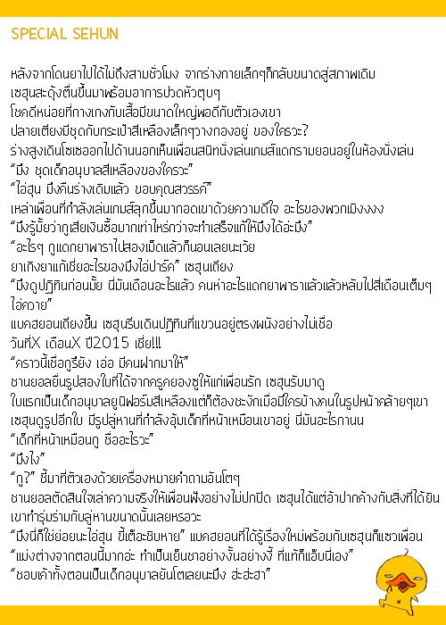 เป็นเวรกรรมของชานยอลที่ต้องไปแงะเพื่อนในร่างเด็กอนุบาลออกจากอ้อมอกครูพี่เลี้ยงชั่วคราวอย่างลู่หาน ชานยอลและแบคฮยอนกล่าวขอบใจอีกครั้งก่อนจะพากันกลับ อาการไข้ของเซฮุนก็ดูจะเป็นเรื่องใหญ่ไม่น้อย แต่ยังไงซะ ยากลับคืนสภาพก็จะต้องให้เซฮุนกินให้ได้ โชคดีหน่อยตรงที่ยานั่นมันเป็นของเหลว แบคฮยอนใช้หลอดดูดยาดูดของเหลวนั่นขึ้นมาในปริมาณที่พอดีและกรอกเข้าปากเพื่อนรักทันที