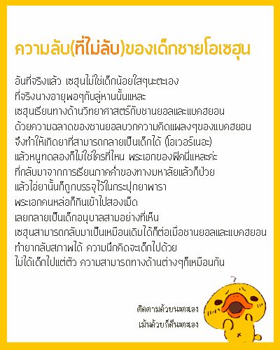 "ปกติเซฮุนเงียบๆนะ พอนายมาสอนเจ้าเด็กนั้นก็ดูเรื่องเยอะเหมือนจงอินขึ้นมาทุกชั่วโมง ตั้งแต่ตอนป้อนข้าวละ ฉันหล่ะหมั่นไส้" ครูคยองซูพูดติดตลกนิดๆ "อย่าให้ได้ใจหล่ะ ไม่งั้นกู่ไม่กลับเหมือนเด็กดำฉันแน่"