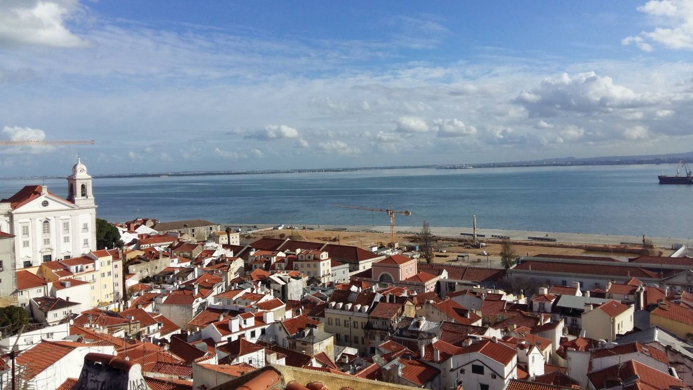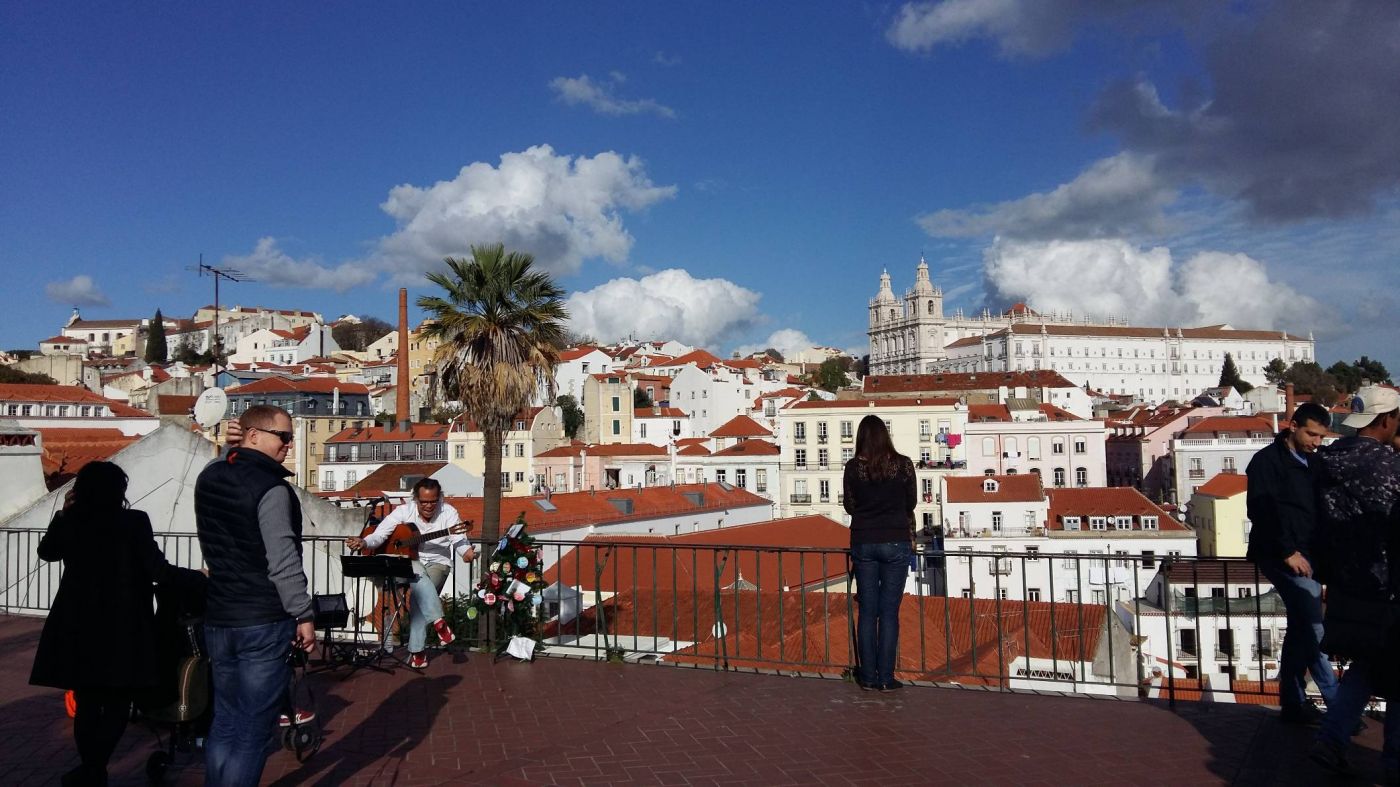 มิราโดโร่ (ฉันไม่รู้ว่าเค้าออกเสียงยังไงกัน แต่ฉันเรียกทุกจุดชมวิวที่โปรตุเกสนี้ว่า .มิราโดโร่.) หรือ viewpoint นี้ เป็นหนึ่งแลนด์มาร์กที่หากมีโอกาสได้มาโปรตุเกส ใคร ๆ ก็ต้องมีรูปที่มุมนี้ด้วยกันทั้งนั้น เนื่องจากหากมองลงไปด้านล่างจะเห็นย่านชุมชนเก่าแก่ Alfama และถัดไปจะเป็นท้องทะเลสีฟ้าใส ใต้ฟ้าสวย เราถ่ายรูปกันพอหอมปากหอมคอที่บริเวณนี้ ฉันค่อนข้างผิดหวังกับวิวที่เกือบจะสวย หากไม่มีรถเครนยักษ์ และสิ่งก่อสร้างบางส่วนเบื้องหน้ามาบดบังทัศนียภาพ แต่โดยรวมแล้วก็ยังฟินอยู่ดี
