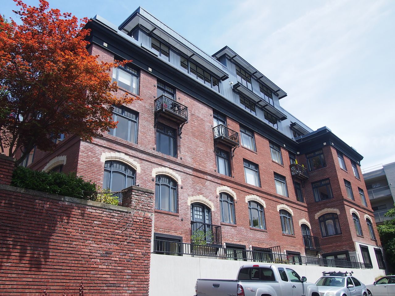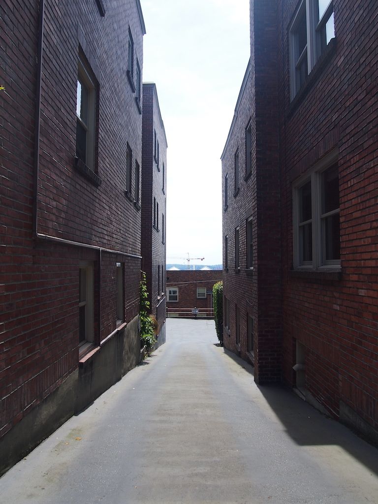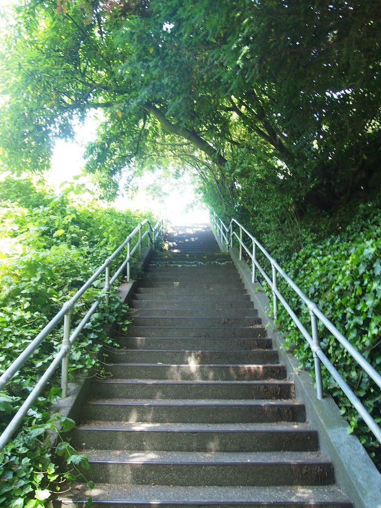 เธอก็เลยพาเดินอ้อมตึกมาที่ทางขึ้นที่มีต้นไม้เต็มไปหมดเลย