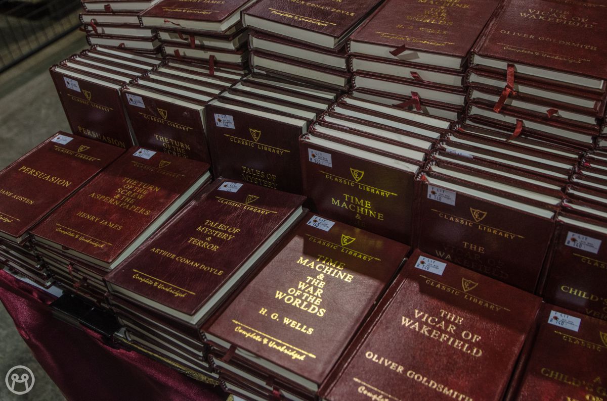 อันนี้ก็คลาสสิคมาก เป็นวรรณกรรมระดับโลกที่หลายคนรู้จักดี เอามาพิมพ์แบเดียวกันเป๊ะ คือพอวางเรียงกันแล้วมีความอลังการ มีความขลัง เสริมความเด่นด้วยตัวอักษรทองบนปกหนัง