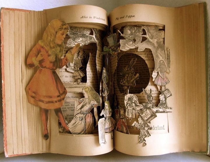 (ตัวอย่างหนังสือ Pop up book เรื่อง Alice in wonderland ) อย่างหนังสือเล่มนี้ เเทนที่จะเป็นการเปิดหน้าใหม่แล้วเจอ Pop up แต่ทำให้น่าสนใจด้วยการใส่ตัวละครในเรื่องลงไปเป็นฉากสามมิติแทน เก๋นะ ว่าไม่ได้