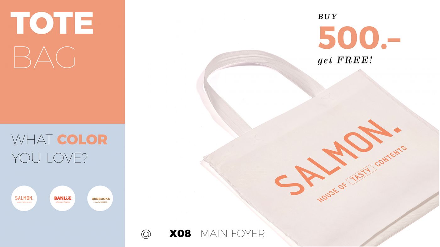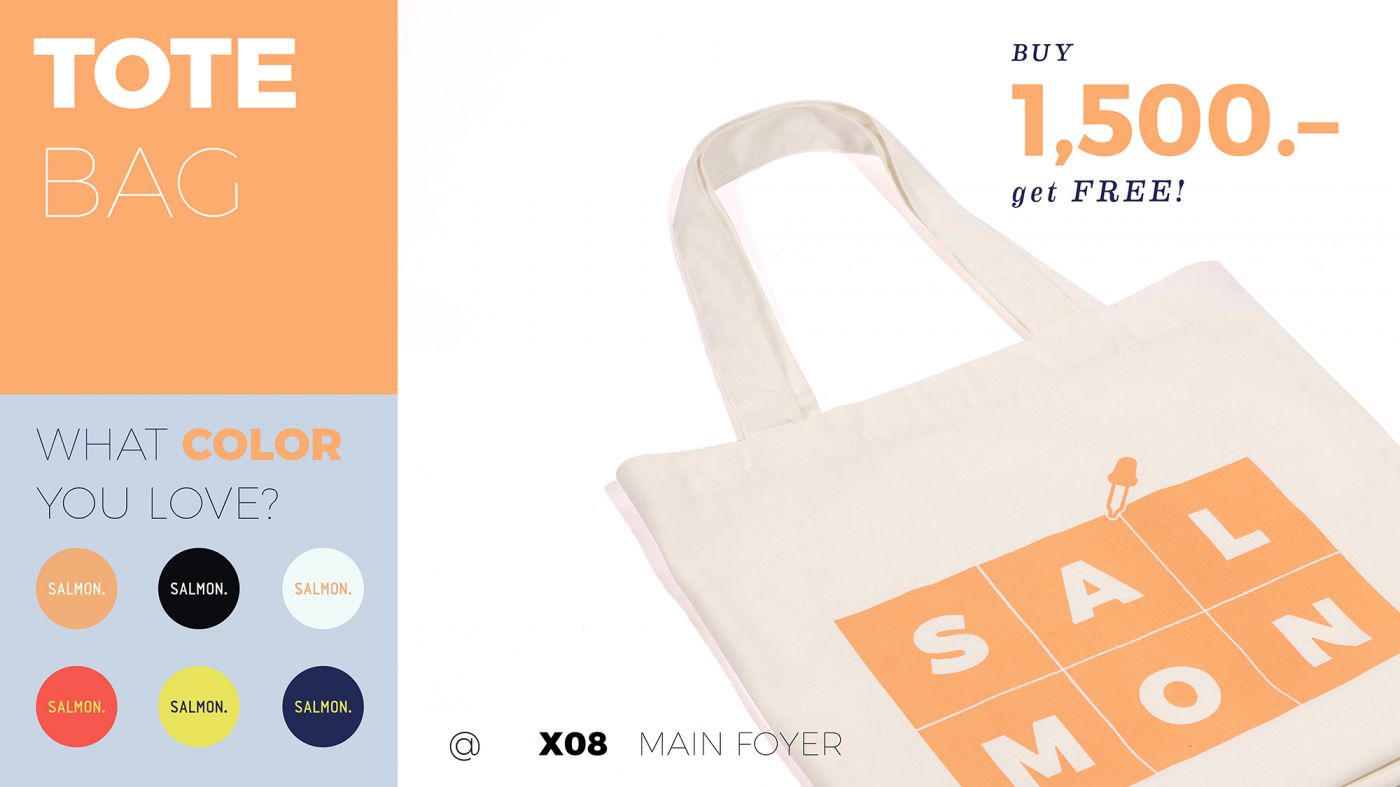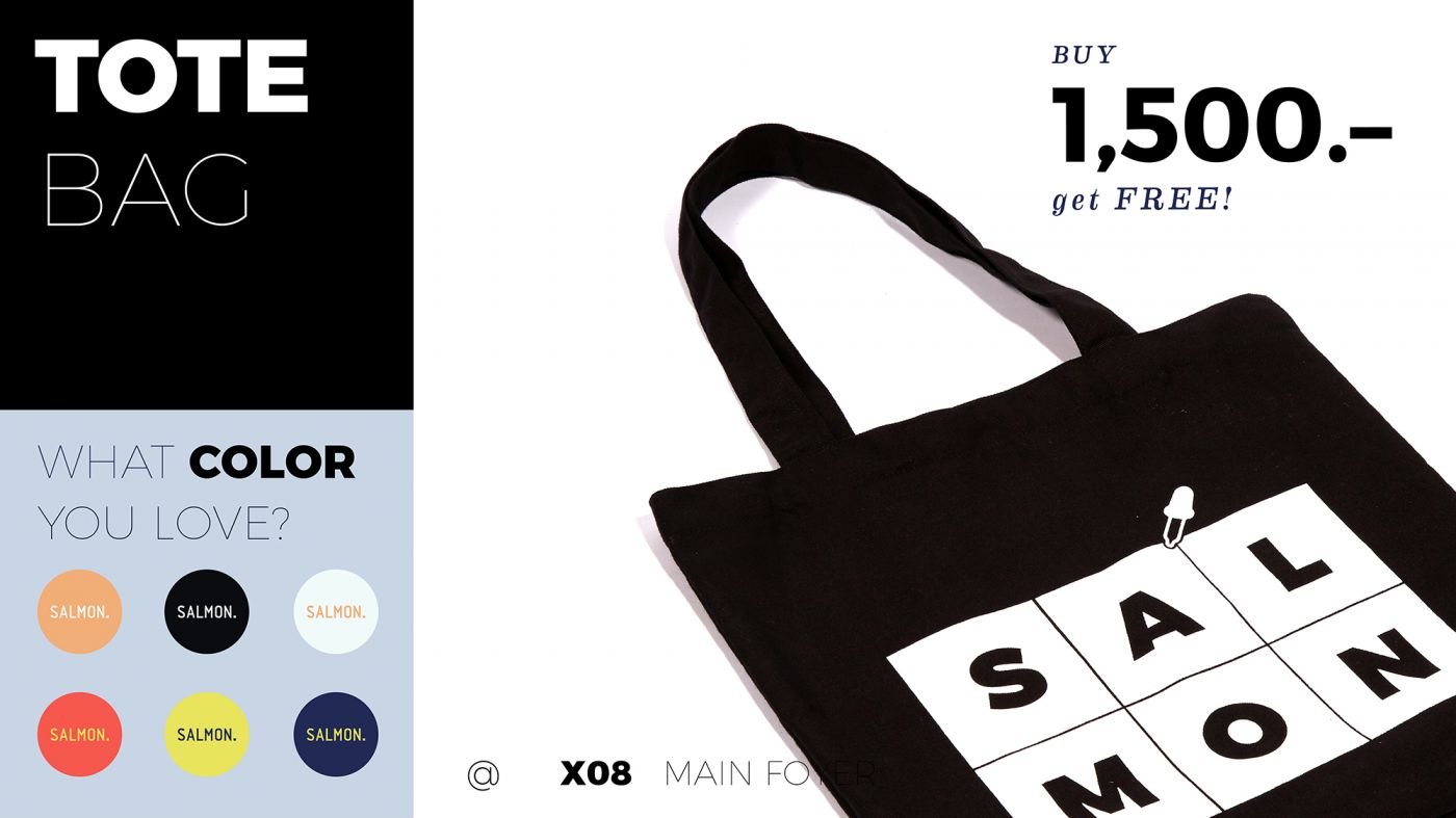 —ซื้อครบ 1500 บาท (หลังหักส่วนลด) รับฟรี TOTE BAG SALMON. 1 ใบ เลือกสีใดก็ได้ที่ชอบ แต่ละสีมีจำนวนจำกัด ถ้ามาช้าสีที่ชอบอาจจะหมดก่อนนะ