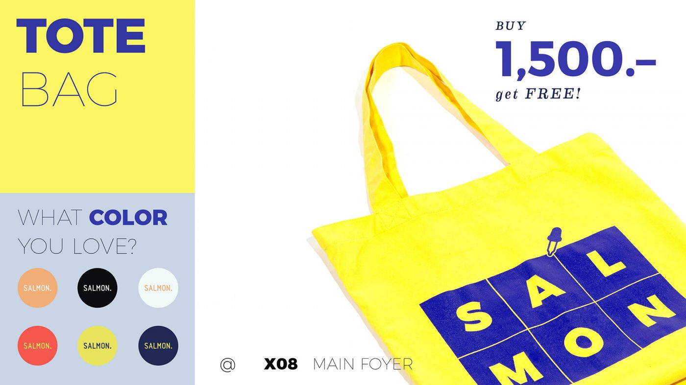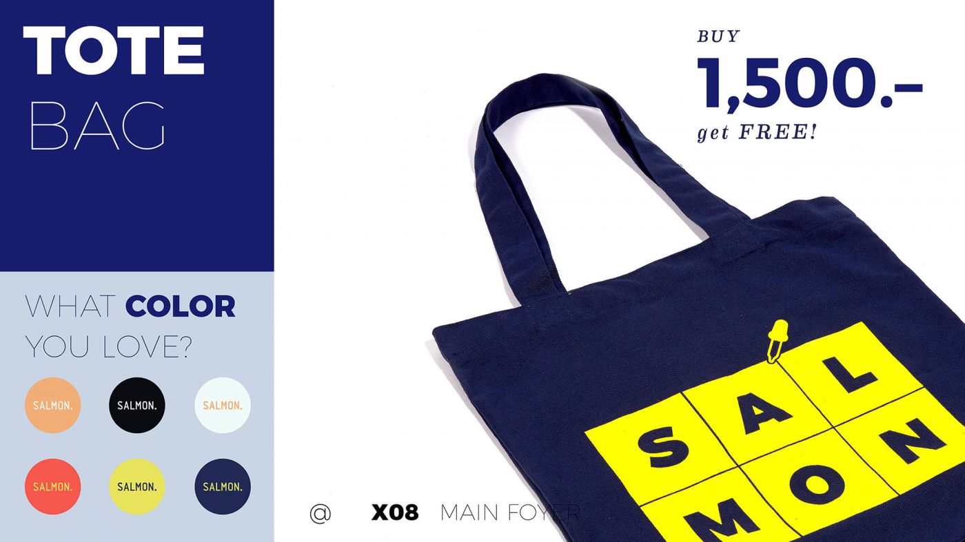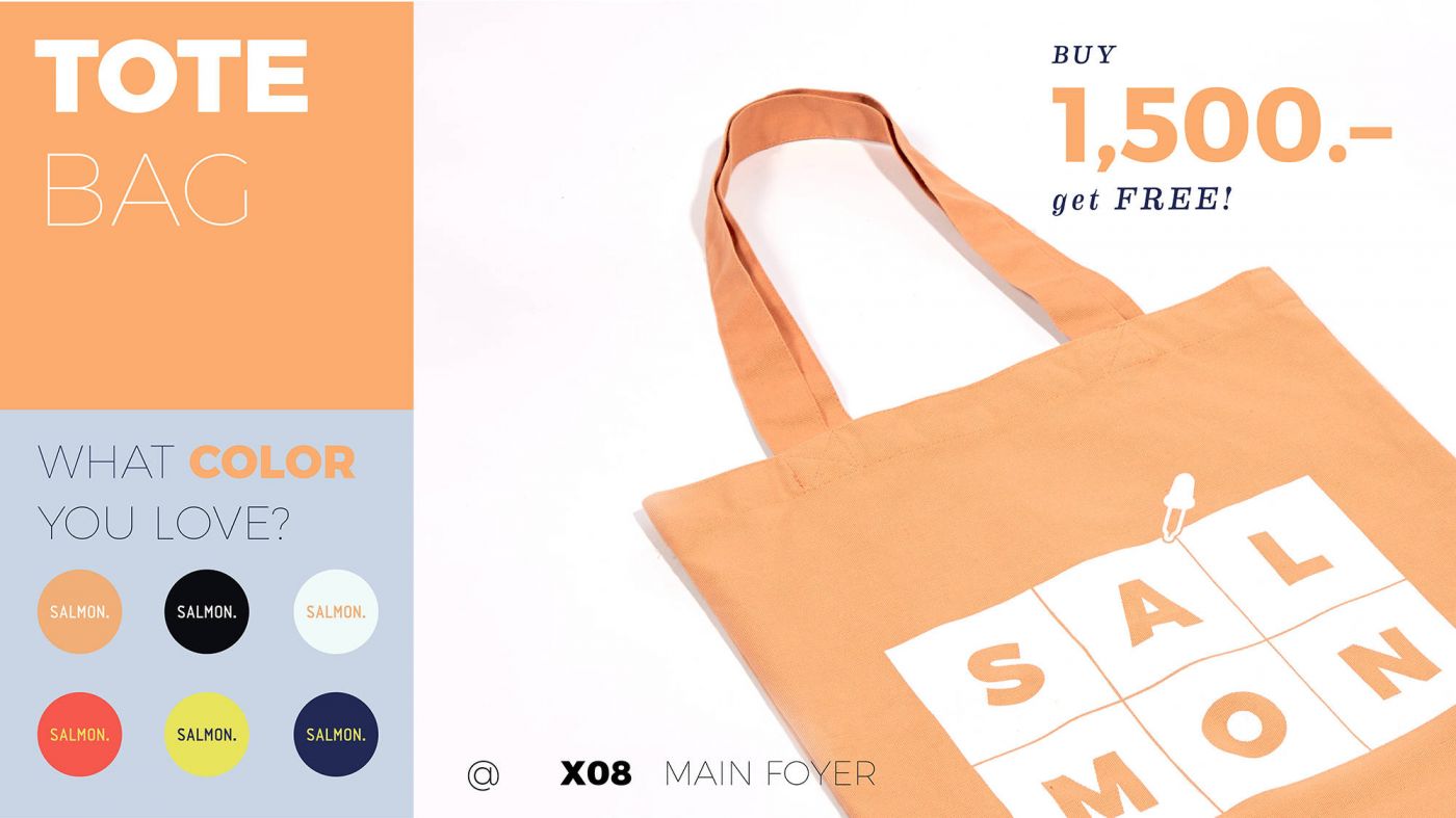 —ซื้อครบ 1500 บาท (หลังหักส่วนลด) รับฟรี TOTE BAG SALMON. 1 ใบ เลือกสีใดก็ได้ที่ชอบ แต่ละสีมีจำนวนจำกัด ถ้ามาช้าสีที่ชอบอาจจะหมดก่อนนะ