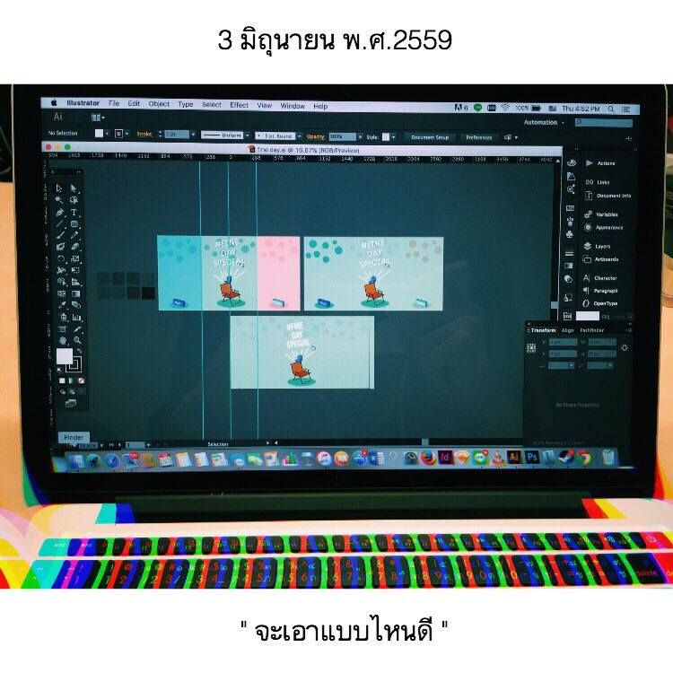 ปัญหาของเด็กฝึกงานกราฟฟิก และคนทำกราฟฟิกทุกคน เวลาทำงาน คือทำมาหลายแบบไงแล้วในความคิดตัวเองคือ เห้ยมันสวยทุกอันอ่ะ แต่ส่งได้อันเดียวเว้ย จะเอาอันไหนดีวะ คิดมากจนต้องถ่ายรูปมาบ่นในทวิตเตอร์อ่ะ แต่สุดท้ายด้วยสามารถของพี่กราฟฟิกสุดน่ารักของเราที่เลือกปกออกมา สุดท้ายก็ได้ปกของ Fineday Special ในที่สุด...... เหย่