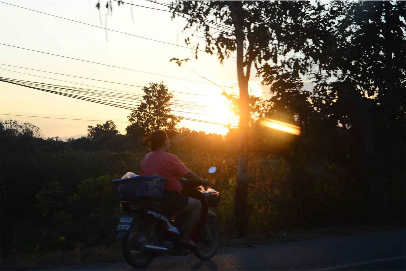 เหมือนกับระหว่างที่ผมนั้งคิดถึงเรื่องนี้ รถก็ยังขับต่อไป ต้นไม้เขียวๆที่ไม่น่าสนใจทุ่งนาผืนกว้างไม่มีไรแปลกใหม่ พระอาทิตย์ดวงเดิมนั้นก็เริ่มทักทายสาดส่องมากระทบหน้าผมเหมือนบอกว่าจะไปแล้วนะเฝ้ามองฉันดีๆฉันมีภาพแสนพิเศษให้ดูก่อนฉันจะไปแสงอาทิตย์สาดส่องยังเหล่าต้นไม้นั้น ใบไม้ใบเล็กใบน้อย เปล่งประกาย ทุ่งนาผืนกว้างดูอบอุ่นด้วยแสงอาทิตย์เบาๆที่ใกล้จะลับขอบฟ้า ท้องฟ้าค่อยๆกลืนเปลี่ยนสีออกส้มชมพูอบอุ่น ก่อนจะค่อยๆมืดและหลับลงเหมือนกระซิบเบาๆว่าพบกันใหม่นะ