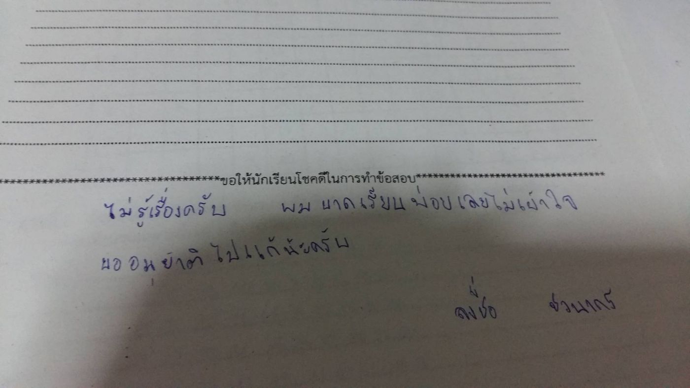 ช่วงวันหยุดสั้นๆ เราได้ไปอยู่บ้านพี่ที่เป็นคุณครูสอนคณิตศาสตร์ระดับมัธยม เราเลยมีโอกาสได้ช่วยกรอกคะแนนข้อสอบให้พี่เรา ตรวจๆ ไป พบกับแผ่นนี้ เราขำมาก เพราะนึกถึงตัวเองที่ก็เคยเขียนข้อความประมาณนี้ในข้อสอบวิชาฟิสิกส์ตอน ม.ปลาย 5555555 ปล.ฉันเกลียดคำว่า อนุยาติ กับคำว่า น้ะ ของเธอ 55555 รู้เลยว่านอกจากวิชาคณิตศาสตร์ เธอยังไม่ตั้งใจเรียนวิชาภาษาไทยด้วย 55555 มีการลงชื่อด้วยนะ 55555555555