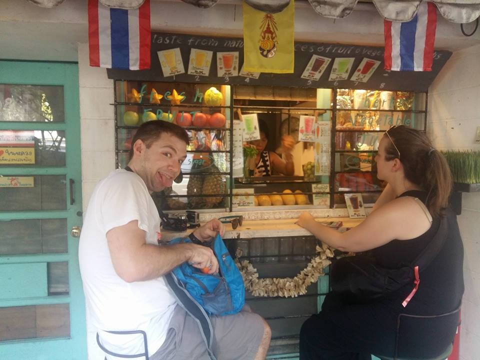 จริงๆ แล้ว รูปนี้เราตั้งใจจะถ่ายแค่ร้าน เพราะน่ารักดี เป็นร้านน้ำผลไม้สดปั่นที่มีแค่หน้าต่างกระจกใสที่มีผลไม้หลายอย่างวางโชว์ แต่คุณลูกค้าของร้านคนนี้เขาหันมาเจอตอนเรากำลังยกโทรศัพท์ถ่ายพอดี เลยทำตัวเป็นายแบบให้ 5555555