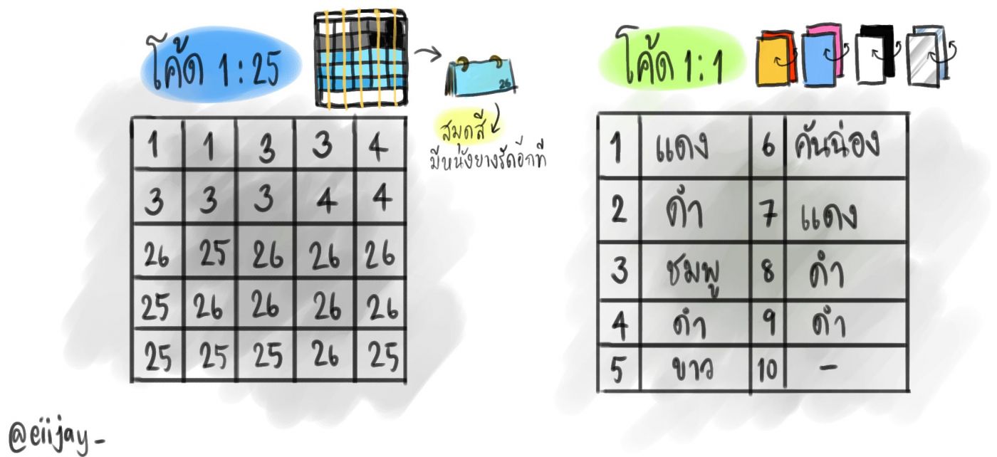 เป็นตารางๆ แต่มีหลายชุดนะ แล้วจะมีตัวอักษรสี(เหลือง แดง ฟ้า ชมพู เป็นต้น) เรียกว่าโค้ด1:1ค่ะ(ด้านขวา) ถ้าเขาสั่งอันนี้ เราก็ต้องหยิบสีที่อยู่ในตารางให้ตรงกับเลขโค้ดที่เขาสั่ง