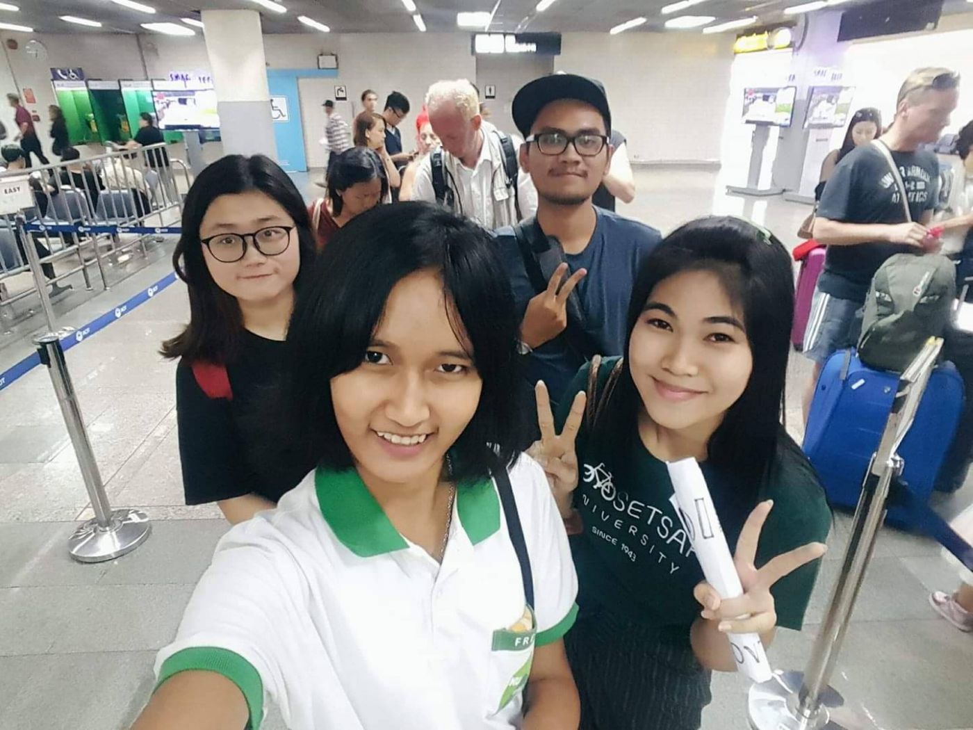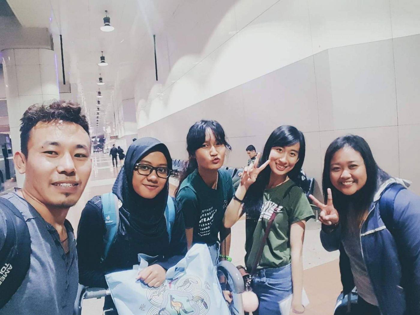 แก๊งต่างชาติ (Kunchok ผู้ชาย, Taqiya ใส่ฮิญาบ และ Amelya คนขวาสุด) เราคนกลางและพี่บัวเป็นบัดดี้