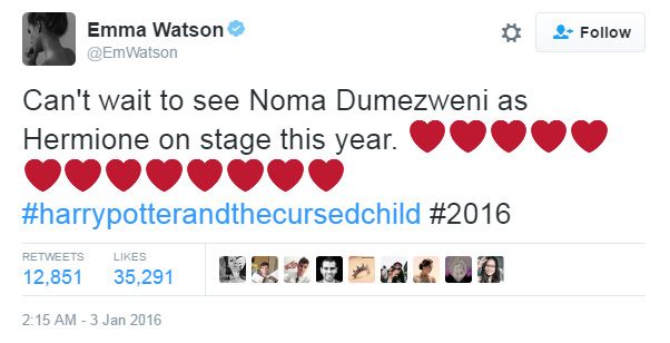 นอกจากโรวลิ่งเองแล้ว เอ็มม่า วัตสัน หรือเฮอร์ไมโอนี่ในภาพยนตร์ก็ยังออกมาแสดงความเห็นผ่านทวิตเตอร์เช่นกันว่าแทบจะรอดูนอม่าเล่นเป็นเฮอร์ไมโอนี่บนเวทีไม่ไหวเลย พร้อมกับหัวใจรัวๆ