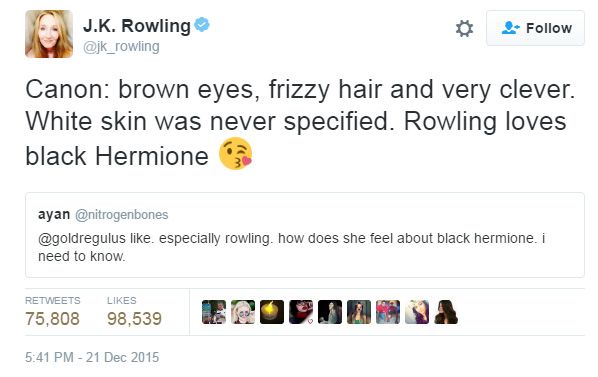 แล้วคนเขียนล่ะว่าไง มีคนเถียงกันว่าในหนังสือก็มีคำที่เขียนว่าเฮอร์ไมโอนี่ผิวขาวนะ โรวลิ่งบอกกับ The Observer ว่า มีพวกเหยียดผิวหลายคนคิดว่าแค่เฮอร์ไมโอนี่หน้าถอดสีเพราะช็อค (ในหนังสือใช้คำทำนองว่า turned white หรือไม่ก็ 'Hermione's white face' ) ก็กลายเป็นว่าเธอผิวขาว เธอเลยตอบกลับไปง่ายๆ อย่างกระตือรือร้นว่า เฮอร์ไมโอนี่ก็เป็นผู้หญิงเชื้อชาติอื่นได้นะ!  นอกจากนี้เธอยังทวีตอีกว่า “ต้นฉบับ: ตาสีน้ำตาล ผมหยิกฟูและฉลาดเป็นกรด แต่ไม่เคยเจาะจงไปเลยนะว่าผิวสีขาว โรวลิ่งรักเฮอร์ไมโอนี่ผิวสีนะ *อีโมจิจุ๊บๆ*”