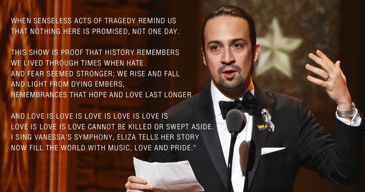 ในช่วงต้น(ที่ไม่ได้ยกมา) มิแรนด้ากล่าวยกย่องภรรยาและลูก ในช่วงหลังเขากล่าวถึงเรื่องราวที่น่าจะอ้างอิงถึงเหตุการณ์ที่ Orlando และย้ำเตือนว่านี่ไม่ใช่ครั้งแรกที่ต้องเจอกับความรุนแรงจากการเกลียดชัง อย่าให้มันเอาชนะเรา แม้เป็นถ่านไม้ใกล้เป็นเถ้าก็ยังมีไฟคุ จงมีความหวัง และอยู่เพื่อทำให้โลกนี้มีแต่ดนตรี ความรัก และศักดิ์ศรี(ของความเป็นคน)