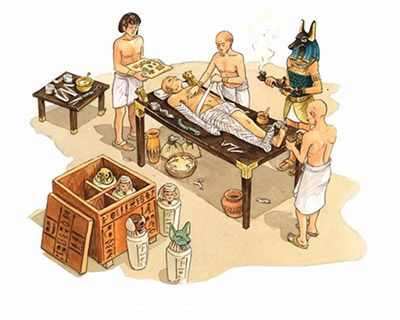 ส่วนวิธีเอาเครื่องในออก สัปเหร่อจะใช้มีดผ่าที่ช่องท้องด้านซ้ายแล้วล้วงทุกอย่างออกมา วัตถุดิบสำคัญในการดองมัมมี่ที่ชาวอียิปต์โบราณใช้มีชื่อว่า "นาตรอน" ซึ่งก็คือ เกลือโซเดียมคาร์บอน์เนต นั่นเอง เครื่องในที่ถูกล้วงออกมาจะถูกล้างจนสะอาด ก่อนหมักเกลือนาตรอนไว้จนแห้ง หลังจากนั้นจะถูกห่อด้วยผ้าแล้วนำไปเก็บใน "โถคาโนปิค" ที่มีฝาเป็นเศียรของเทพ 4 องค์ แต่ละโถมีหน้าที่เก็บอวัยวะภายในแต่ละส่วนต่างกันไป
